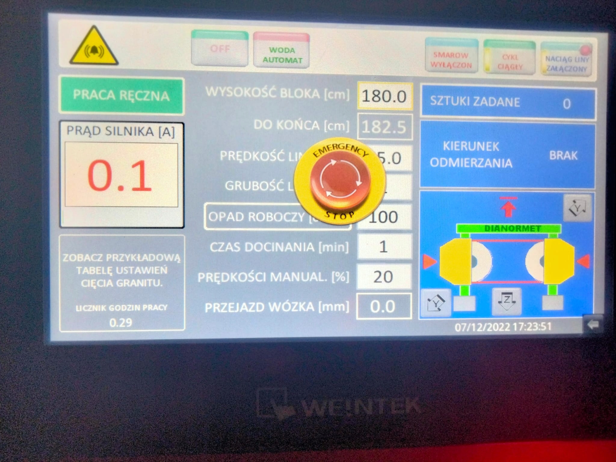 STJD-2200 — это очень простой станок для разделения каменных блоков и резки их на плиты с помощью простых разрезов с помощью одного алмазного каната. Жесткая и устойчивая конструкция машины состоит из двух чугунных опор, соединенных стальной балкой. Канатные блоки диаметром 2200 мм поднимаются и опускаются с помощью электродвигателя, приводящего в движение трапециевидные винты, расположенные в центре опор. Главный привод реализован ременной передачей от электродвигателя, в котором скорость вращения регулируется инвертором. Машина оснащена гидравлической системой натяжения троса с регулируемой силой натяжения. Параметры работы данной канатной пилорамы регулируются и задаются из шкафа управления. Monolina оснащена автоматической системой резки и ручным управлением. Трос автоматически возвращается «вверх» на малых скоростях. На дисплее можно прочитать установленные параметры, скорость резки, падение алмазного каната, толщину и количество разрезаемых досок.