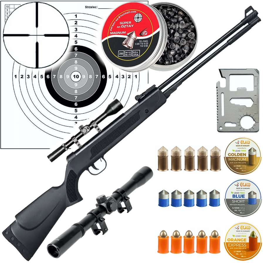 Основной боеприпас, входящий в комплект – пули калибра 4,5 мм. 250 шт. Плюс комплект стрелковых мишеней.