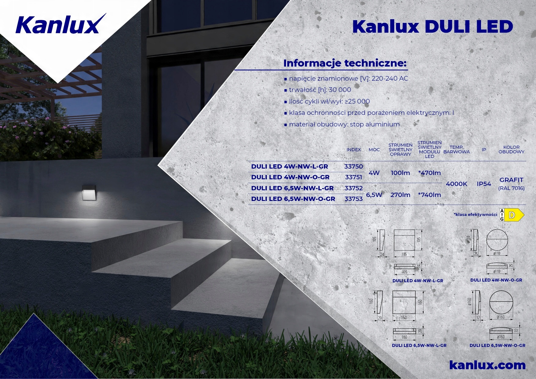 Kanlux DULI LED представляет собой серию фасадные светильники накладного монтажа. Современный геометрический дизайн и простая форма придают этой серии универсальный характер. Матовый графитовый оттенок и самая популярная цветовая температура для архитектурных светильников (4000К) – другие их преимущества. Светодиоды Kanlux DULI выполняют функцию декоративного акцентного освещения, освещая и украшая пространство вокруг здания. Накладные светильники Kanlux DULI LED питаются от сети 230В без необходимости использования дополнительного источника питания.