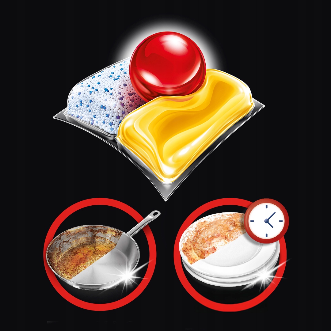 Это капсулы для посудомоечной машины, которые гарантируют идеальную чистоту при каждом использовании. Их усовершенствованная формула с технологией ACTIVELIFT обеспечивает в 2 раза большую очищающую способность*, справляясь со всеми типами остатков пищи, даже с теми, которые сушились в течение 48 часов.