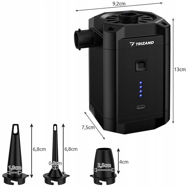 Универсальный в использовании аккумуляторного насоса - это устройство, которое хорошо иметь с вами во время бивуака или поездки на пляж. Это не занимает много места, поэтому вы можете легко хранить его в сумке или рюкзаке, когда он не используется. Насос имеет до 3 различных кончиков (диаметр 0,6/1,1/1,7 см), поэтому вы можете использовать его для надувания множества различных надувных аксессуаров, таких как матрасы, шарики, понтоны, надувные игрушки, бассейны. Насос на матрасе очень твердо изготовлен, благодаря тому, что он будет служить за невыполненными годами. Заряжено через USB Typ-C