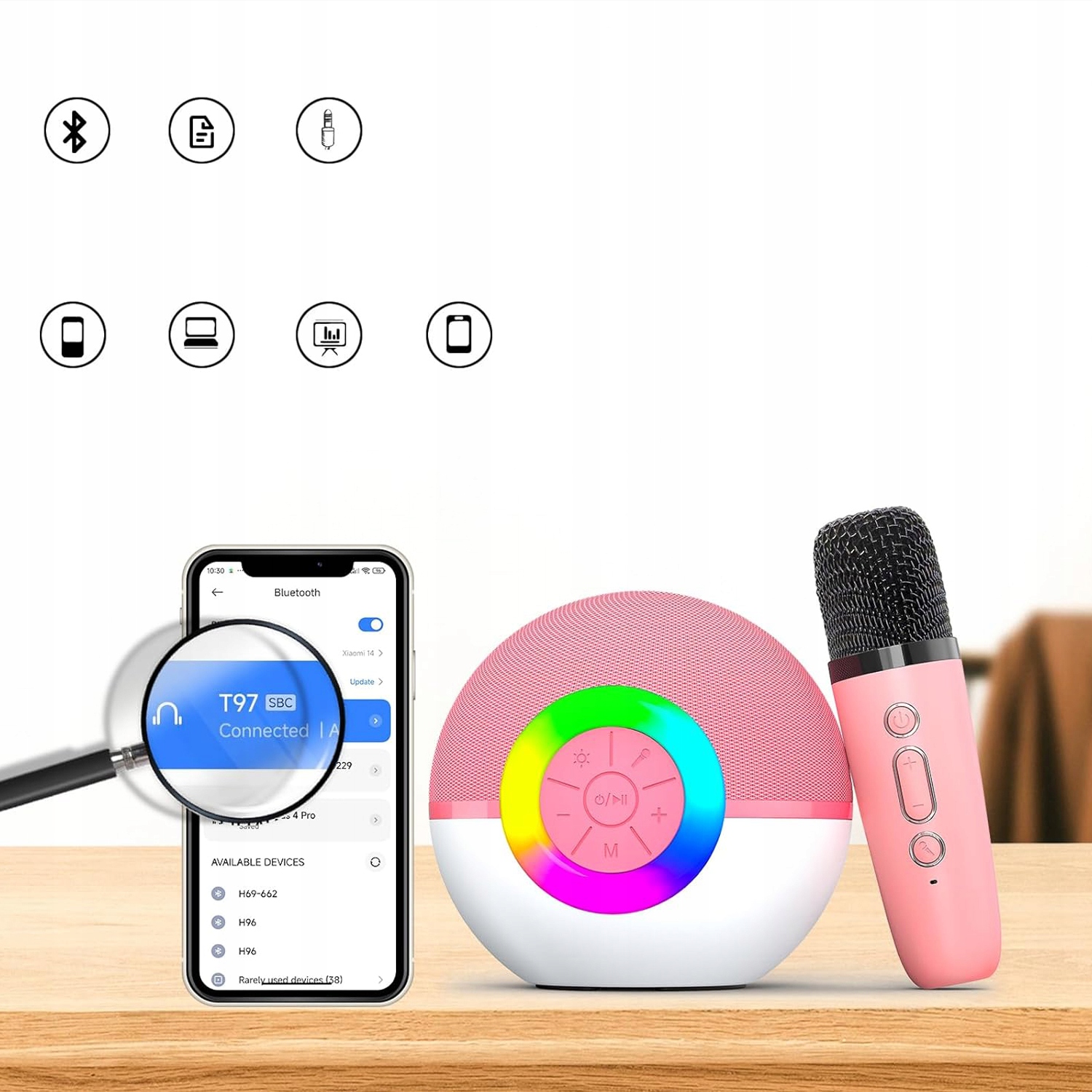 - 🎵Чтобы подключиться к телефону или компьютеру, включите Bluetooth на микрофоне для караоке и выберите «T97» на своем устройстве.