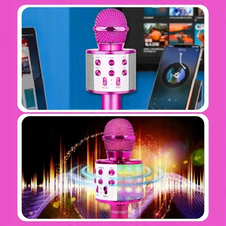 - ПРИВЛЕКАТЕЛЬНЫЙ ВНЕШНИЙ ВИД - блестящий, металлический цвет всегда очень популярен. Впечатляющий дизайн дополняется нежной подсветкой динамиков, которая при включении светится синим цветом. На выбор предлагается 4 цвета микрофона — черный, серебристый, светло-розовый и розовый. Этоидеальный подарок независимо от возраста.