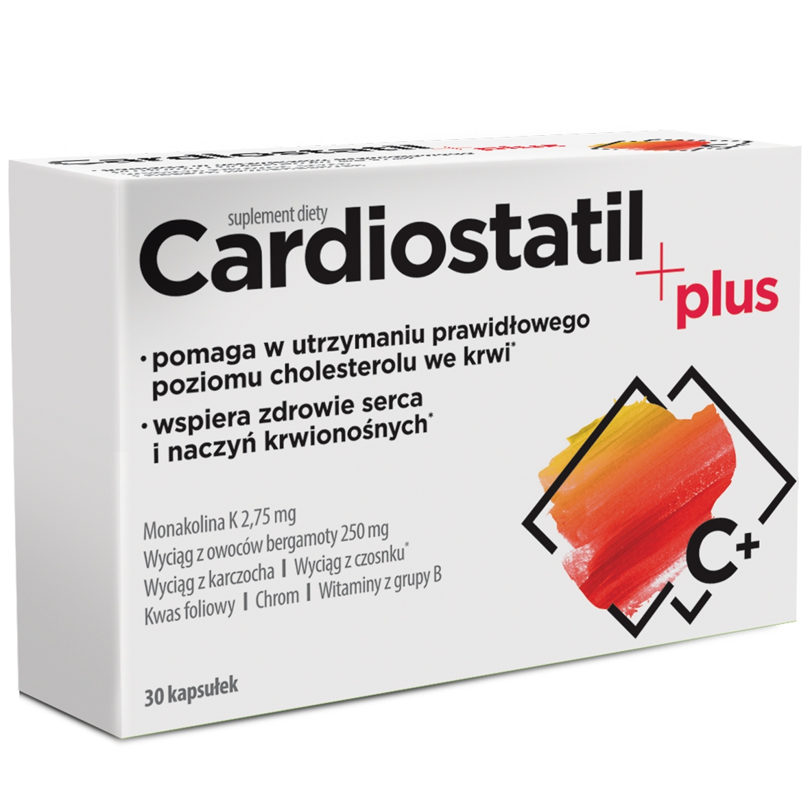 Кардиостатил плюс пищевая добавка включает монаколин K из ферментированного красного риса, а также 250 мг экстракта плодов бергамоты (цитрусовая бергамия), стандартизированные на полифенолах. Экстракт чеснока, содержащийся в продукте, помогает поддерживать нормальный уровень холестерина в крови и поддерживает здоровье сердца и кровеносных сосудов. Кроме того, продукт содержит витамин B6 и витамин B12, которые способствуют поддержанию надлежащего энергетического метаболизма и помогают поддерживать правильный метаболизм гомоцистеина. Композиция продукта была обогащена листьями артишока, которые обладают антиоксидантными свойствами. Он поддерживает правильное функционирование сердца и печени, а также способствует поддержанию нормального уровня липидов в крови. Кроме того, продукт содержит хром, который помогает поддерживать нормальный уровень глюкозы в крови и способствует поддержанию правильного метаболизма питательных макронутриентов. Кроме того, продукт включает в себя фолиевую кислоту, принадлежащую к Фолиану, которая поддерживает правильное функционирование иммунной системы, а также помогает в правильном производстве крови и правильном синтезе аминокислот. Li> Экстракт красного риса Oryza sativa, ферментированная монаскью Purpureus 55 мг, включая монаколин K 2,75 мг