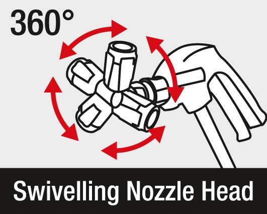 с бесступенчатой регулировкой давления и шарниром, регулируемым на 360°, идеально подходит для очистки закрытых и труднодоступных помещений.