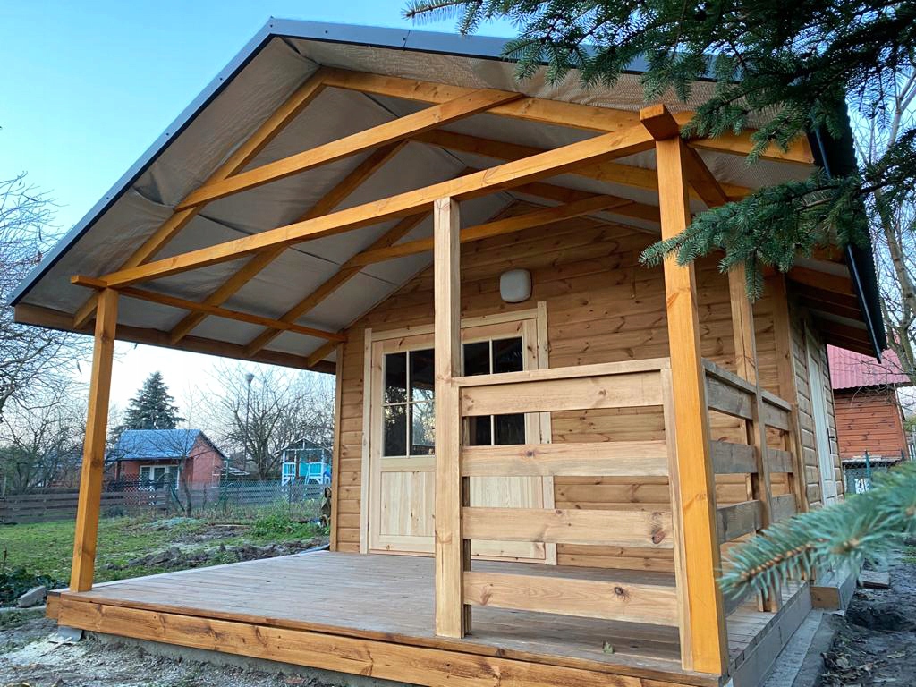 Дом выполнен каркасной конструкции, размерами 400х400 см, покрыт кровлей и обшит фасадной доской.