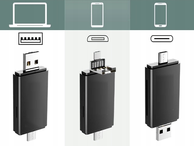 Многофункциональный картридер имеет целых 3 USB-разъёма — USB/USB-C/USB 3.1 тип C/Micro USB.