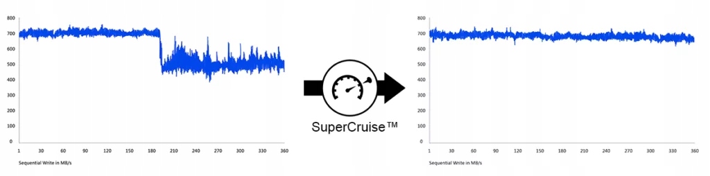SuperCruise™ – Непрерывная запись больших объемов данных, например, в случае записи видео, может привести к внезапному падению производительности или прерыванию записи. Технология Exascend устраняет эту проблему, гарантируя непревзойденную стабильность даже в самых требовательных приложениях. В отличие от многих систем конкурирующих брендов, работоспособность которых сохраняется только на начальном этапе записи, уникальный алгоритм SuperCruise™ обеспечивает сохранение параметров носителя информации до конца работы.