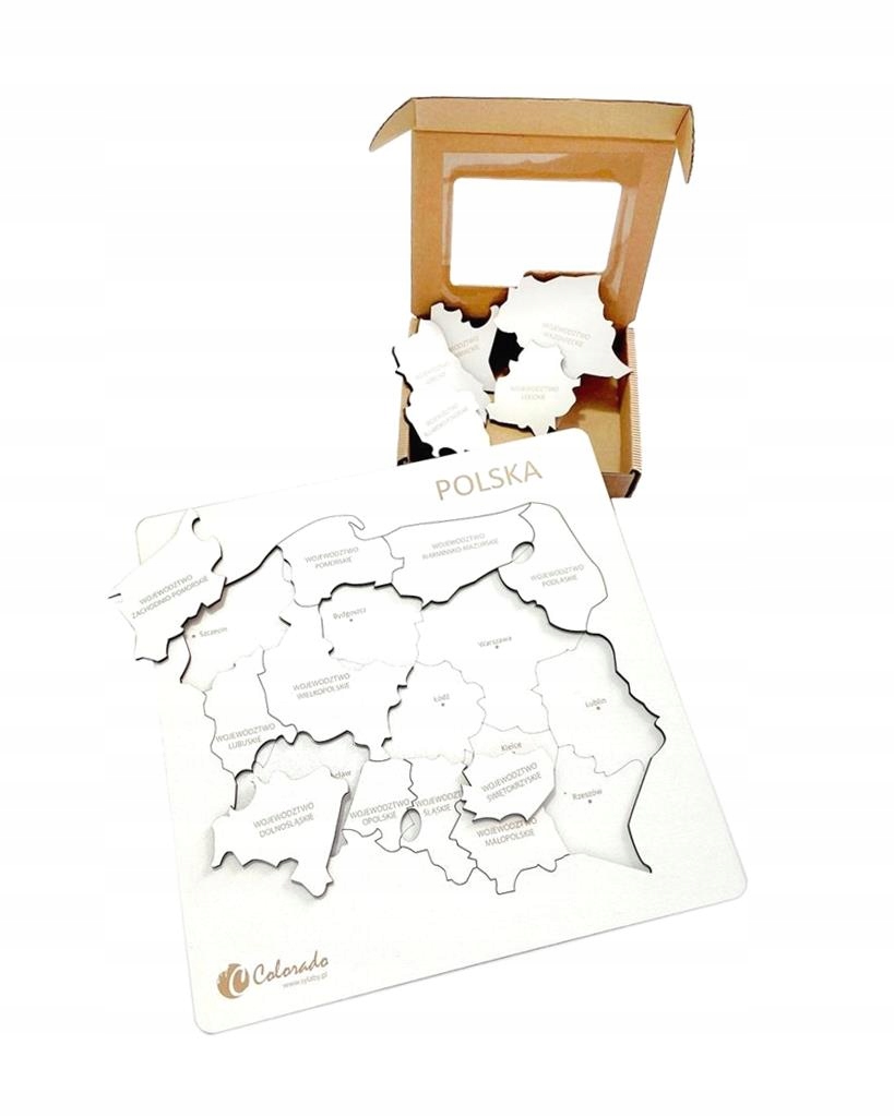 16 пазлов в форме воеводств с выгравированными названиями.