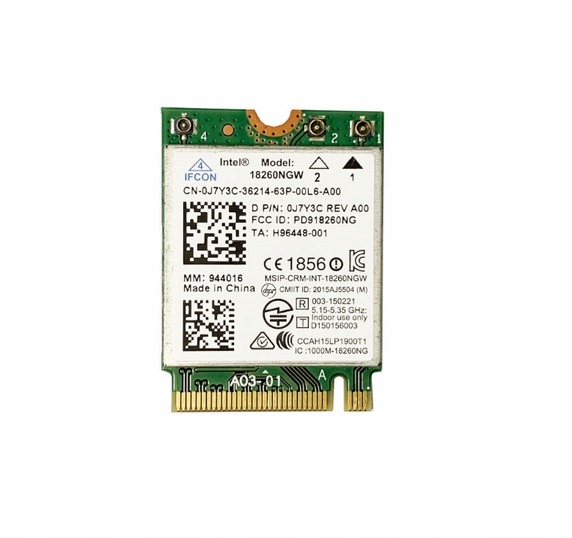 Модуль Intel 18260NGW представляет собой трехдиапазонную беспроводную карту (WiGig 802.11ad + Wi-Fi 802.11ac + Bluetooth), установленную в разъем M.2 2230. Версия dp/n 0J7Y3C / J7Y3C — это OEM-вариант, используемый в ноутбуках Dell (например, серии Latitude) в качестве заводского компонента. Эта карта сочетает в себе высокую производительность, многорежимное подключение и дополнительные функции, такие как беспроводная док-станция.