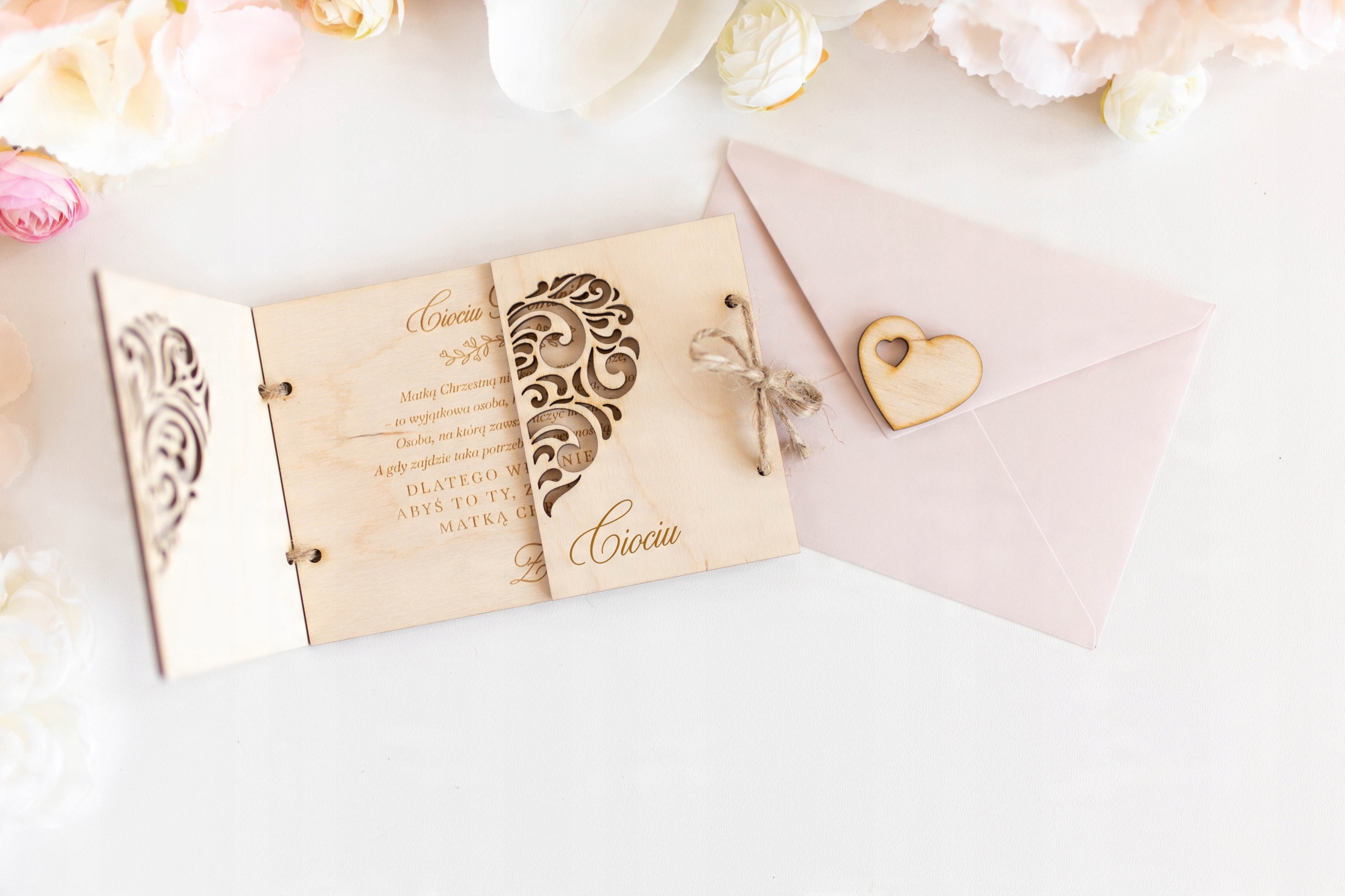 Деревянная книга с красивым вырезанным ажурным узором была перевязана декоративной джутовой веревкой. На обложке большое сердце или крылышки с надписью "Дорогая тетушка, дорогой дядя". Внутри стихотворение и вопрос к крестным :)