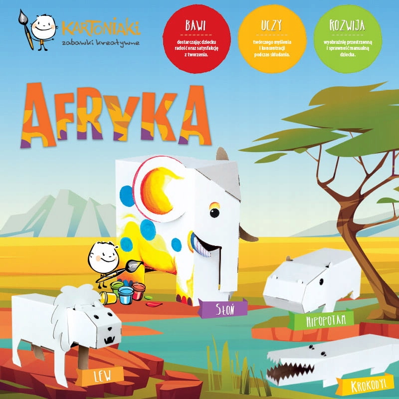 В упаковке: 4 шт. игрушки из картона - лев, бегемот, крокодил и слон, а также хвосты и наклейки с глазками.