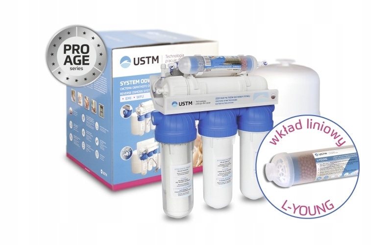 - Современная шестиступенчатая система обратного осмоса, оснащенная тремя фильтрами предварительной очистки, осмотической мембраной и двумя линейными постфильтрами (RO6 Young имеет картридж «L-Young», который минерализует, подщелачивает и ионизирует воду)< /ли>