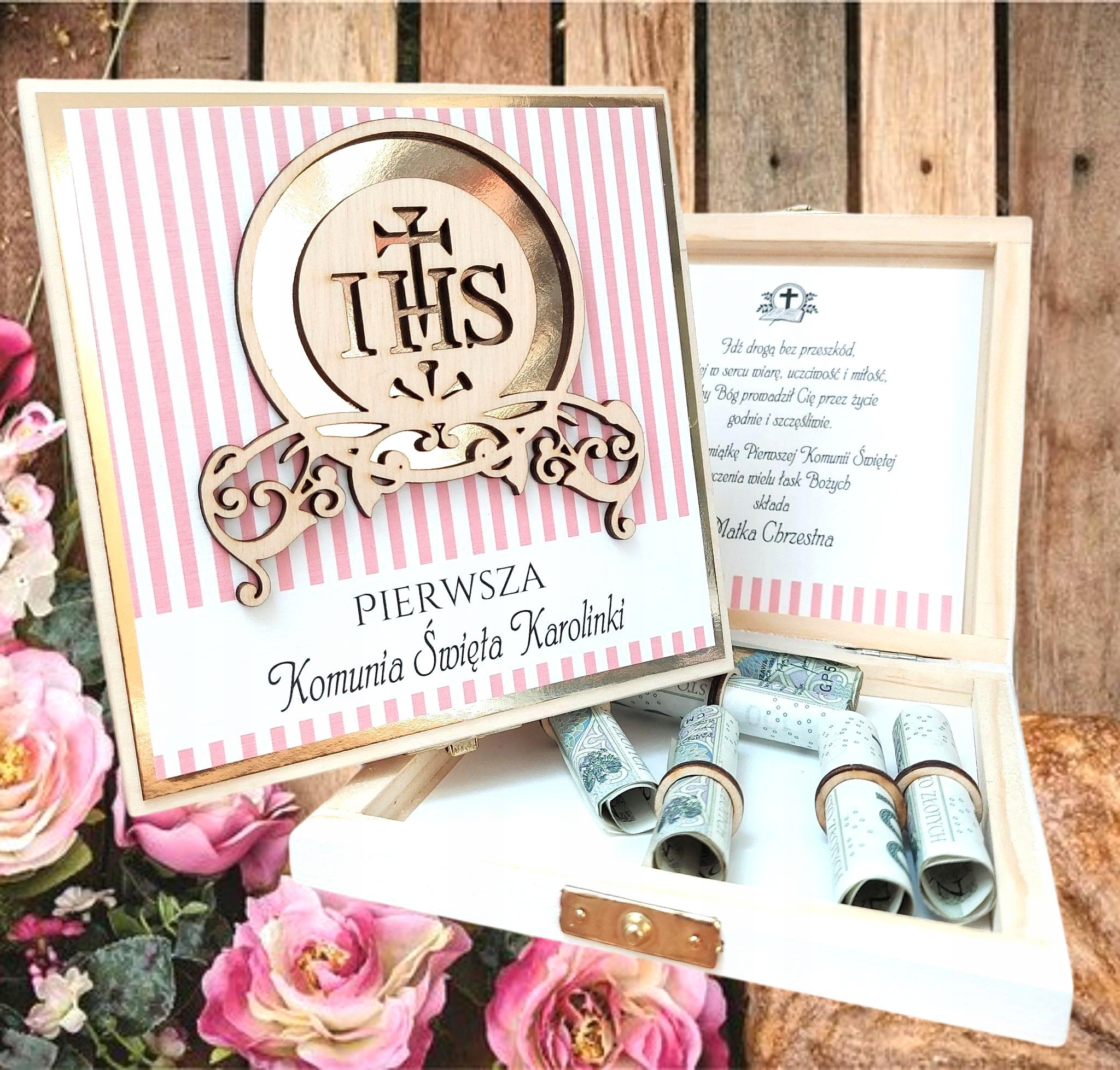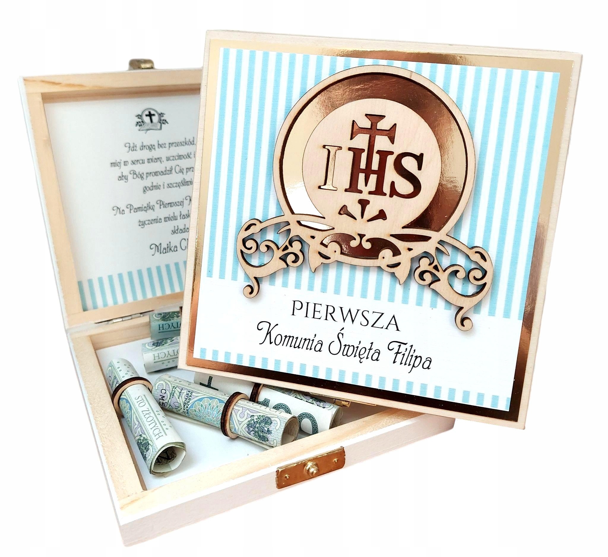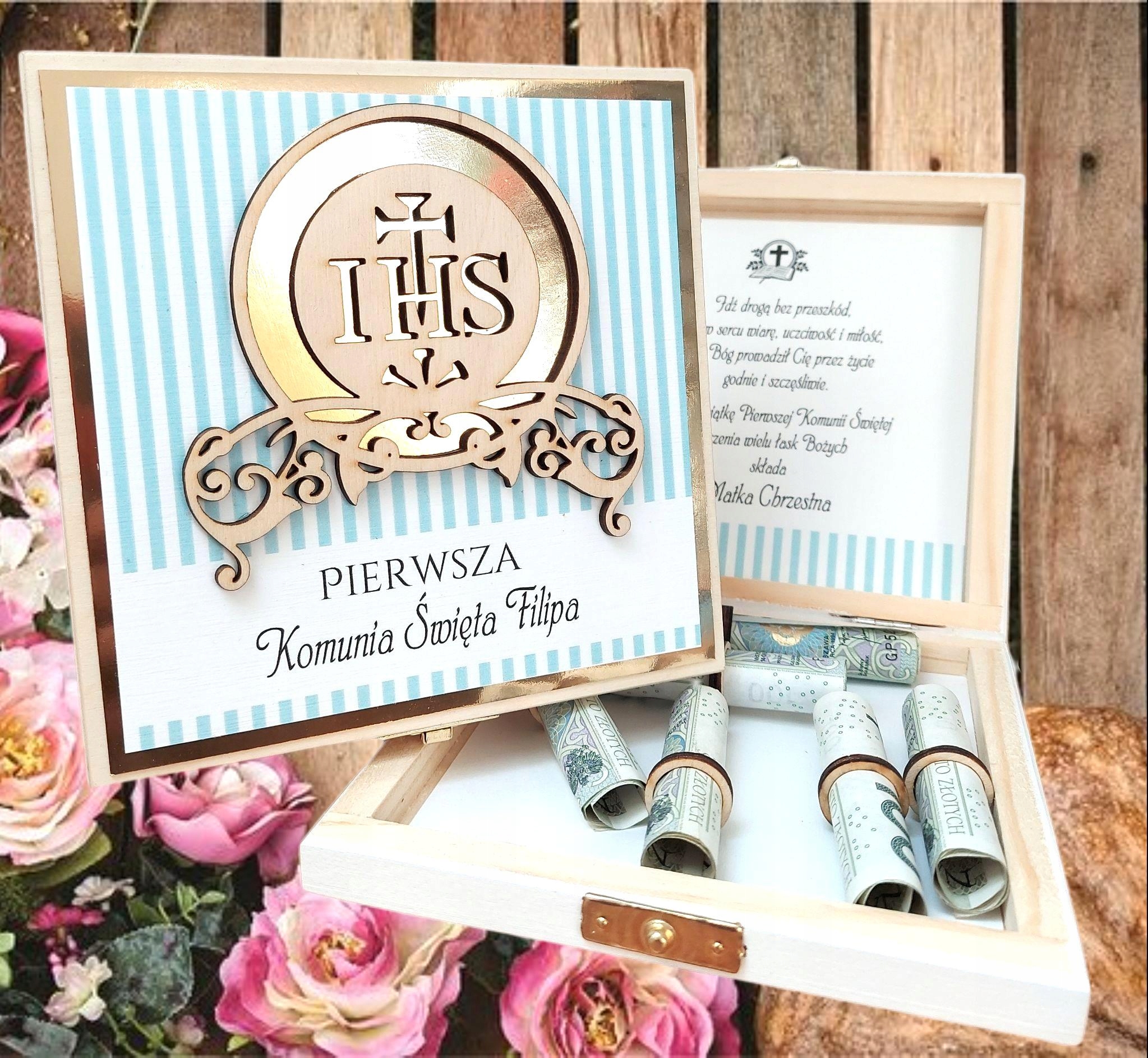 Деревянная шкатулка с местом для денег и индивидуальными пожеланиями в двух цветах.