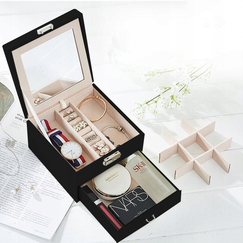 Внутри шкатулки есть шарнирное зеркало, которое идеально подходит для применения макияжа или просто для того, чтобы надеть ювелирные изделия. Под ним, однако, секретное место для хранения для самых ценных украшений. Шкатулка имеет выдвижной нижний ящик с девятью перегородками, благодаря этому вы поместите в них все свои серьги! Ящик также может быть удален из коробки.