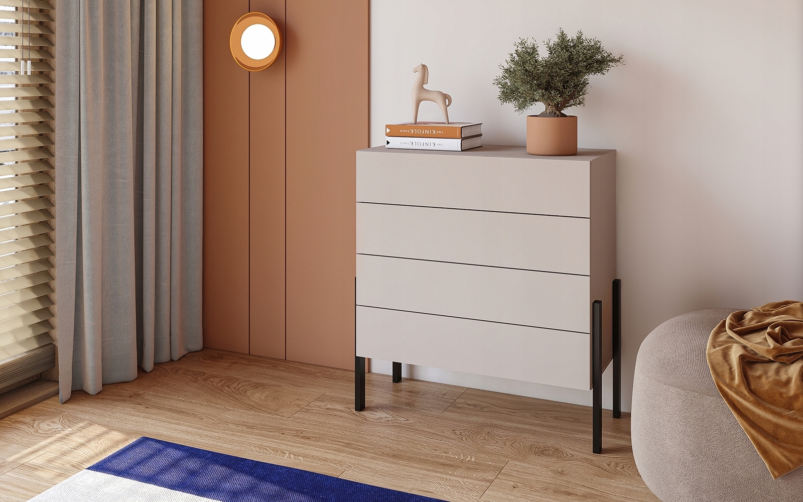 Комод оснащен четырьмя просторными ящиками, в которых удобно хранить одежду, текстиль или мелкие предметы. Каждый из них плавно и бесшумно выдвигается, что повышает комфорт использования. Такое расположение позволяет без особых усилий поддерживать порядок – все находится на своих местах и остается легкодоступным. Устойчивая конструкция, поддерживаемая металлическими ножками, обеспечивает безопасное использование и в то же время оптически приподнимает мебель, делая интерьер светлее и просторнее. Это комод, который действительно упрощает повседневную организацию.