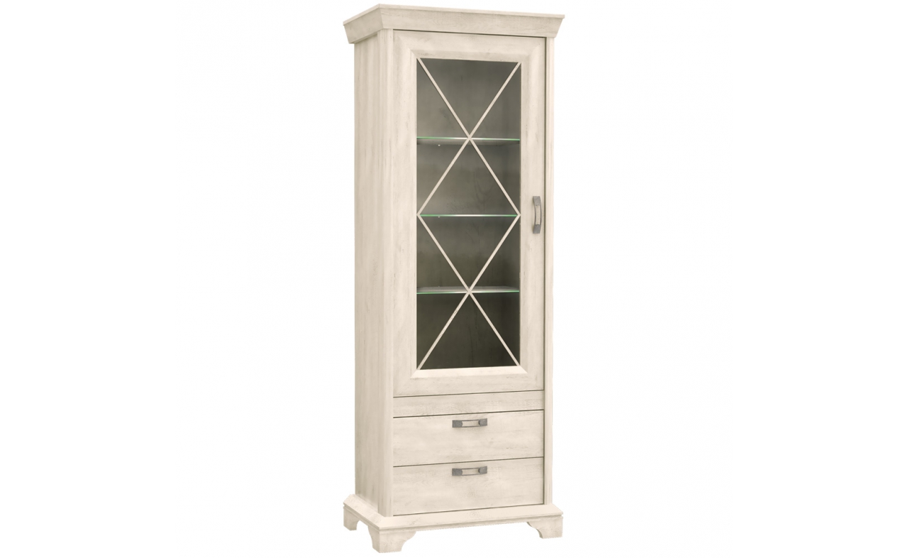 Высокая, узкая витрина из стильной коллекции KASHMIR. Идеально подходит для гостиной и столовой, оформленной в провансальском стиле. Витрина доступна в цвете «Белая сосна». Его отличают черты, типичные для всей коллекции: смелые, декоративные нижний и верхний венцы и ручки цвета старого серебра. Остекление витрины украшено тонкими крестообразными импостами. Подсветка стеклянных полок предоставляется за дополнительную плату. Посмотрите другую мебель из коллекции КАШМИР.