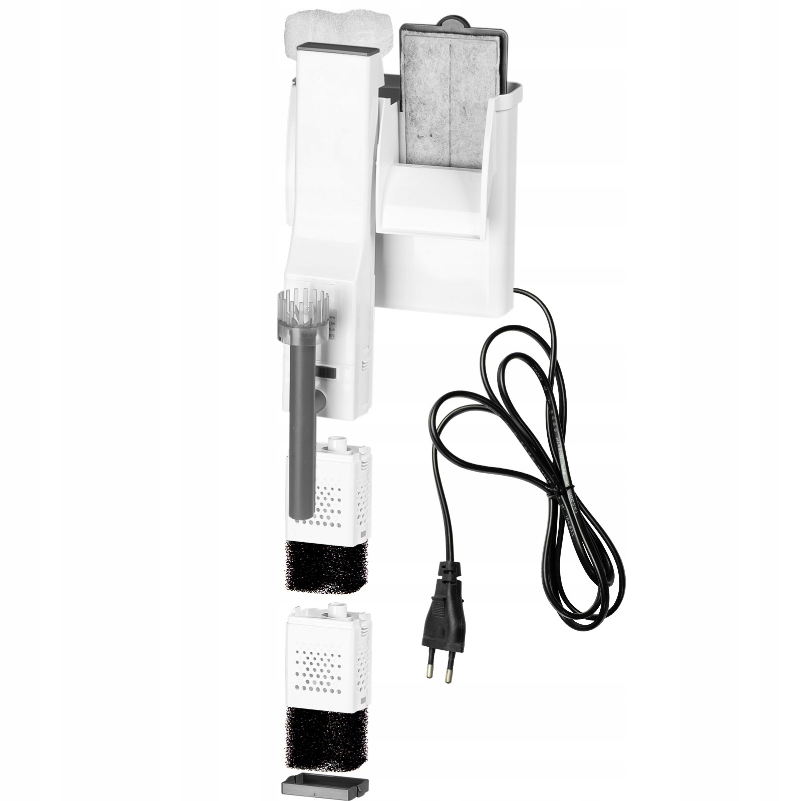 🔹Двойной губчатый предварительный фильтр:Вместо классической трубки для всасывания воды фильтр оснащен двумя модульными корзинами, наполненными аквариумной губкой, которая эффективно фильтрует механически, поддерживая чистоту воды с самого начала.