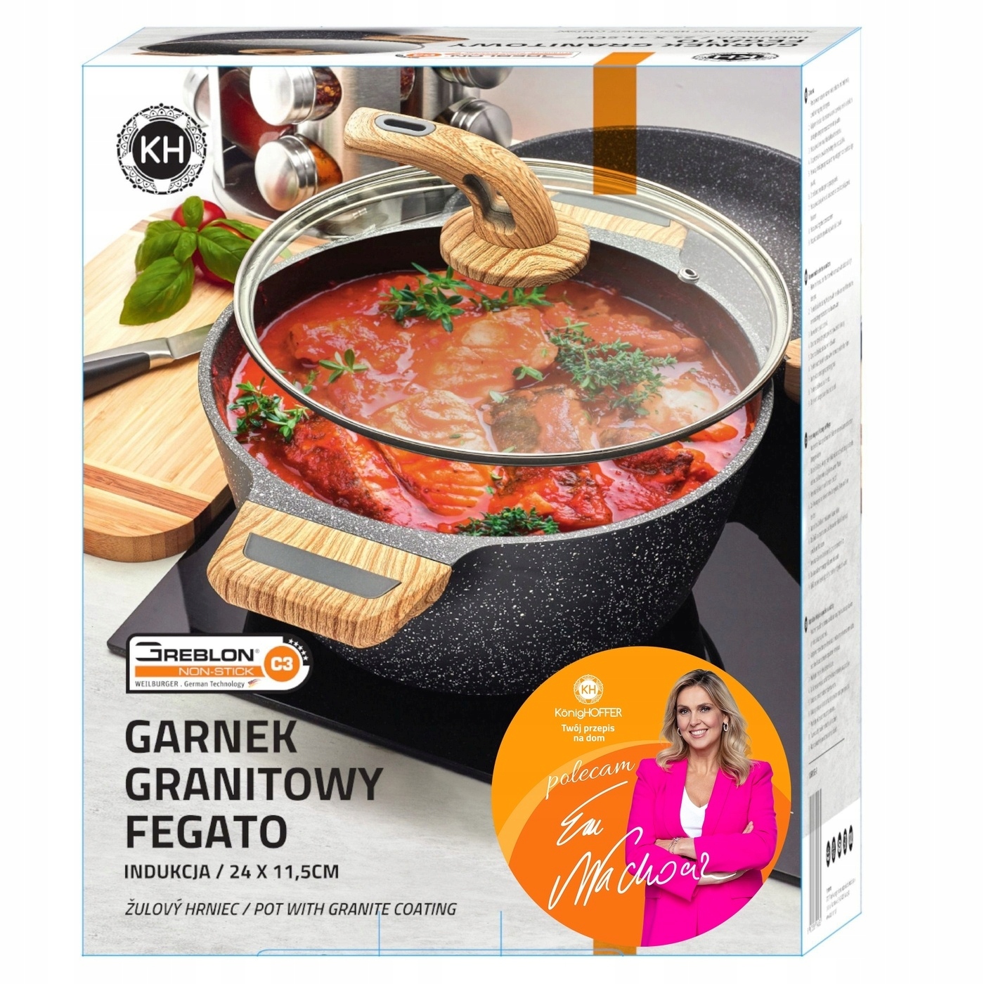 Кастрюля с алюминиевым корпусом с гранитным покрытием, мягкой ручкой и стеклянной крышкой Konighoffer Fegato с покрытием Greblon® C3 Гранит 24 см 4 л – это инвестиция на годы. Ее долговечность и стойкость определяется каменным покрытием Greblon® C3 Granite, состоящим из трех слоев: базовый слой, защитный слой – 4 звезды (8000 циклов – в 4 раза больше, чем у стандартной сковороды с антипригарным покрытием); правильное покрытие, придающее цвет и антипригарный эффект (антипригарное покрытие), а также защитный слой с характерным гранитным эффектом (5 звезд). Сырьевые материалы не содержат производных тефлона (без ПФОК). Это гарантирует долговечность, стойкость и легкую очистку. Изготовлен из алюминия и стеклянная крышка, закрывающая циркуляцию, гарантирует более быстрое приготовление блюд. Мраморный горшок подходит для любого типа плиты (газовой, электрической, керамической, индукционной). Мягкие на ощупь ручки, которые остаются теплыми (кастрюля, крышка), обеспечивают безопасное и комфортное приготовление пищи. Все это выглядит великолепно. Продукт рекомендует Ева Вахович. Как амбассадор бренда Konighoffer, она горячо и с улыбкой рекомендует его для домашнего использования. Вместе с ним вы получите свой рецепт для дома. Это один из лучших вариантов в этой категории!