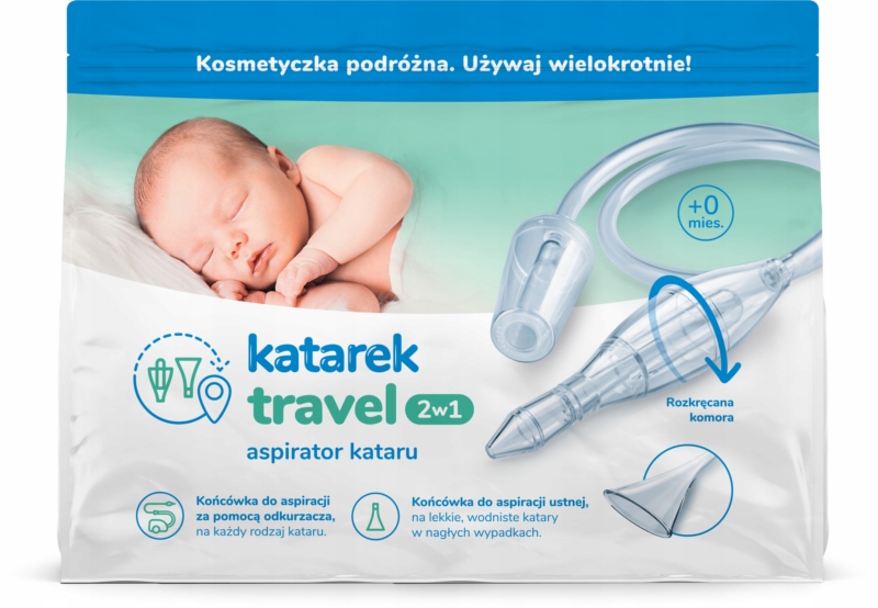 Katarek Travel — аспиратор, сочетающий в себе два решения в одном устройстве. Подключенный к домашнему пылесосу (800/1800 Вт), он всего за несколько секунд удаляет остатки выделений из носа ребенка и позволяет ему или ей дышать свободно. В комплект также входит аспирационная насадка для полости рта, кисточка и дополнительная насадка.