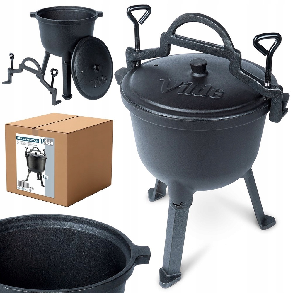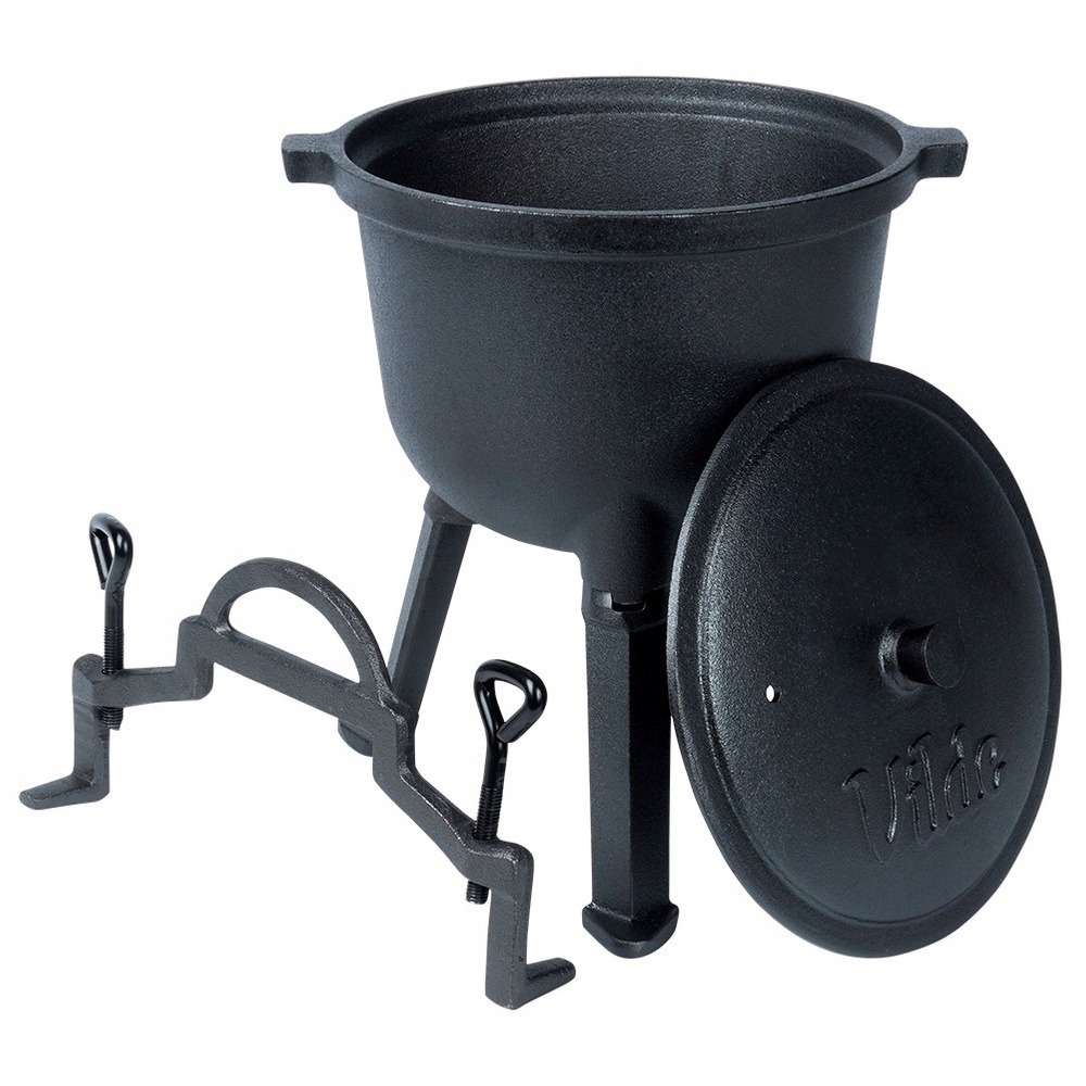 Круглый чугунный котел на ногах с крышкой и ручкой подвески. Идеально подходит для приготовления, выпечки, тушеного и жаркого блюд на костре, гриля или над открытым огнем. Блюда, приготовленные в котле, будут сочными и ароматными. Полезно во время различных встреч, праздников или мероприятий на свежем воздухе. Оригинальный вилде продукт из линии линии линейки. был произведен в соответствии с европейскими стандартами. Cm