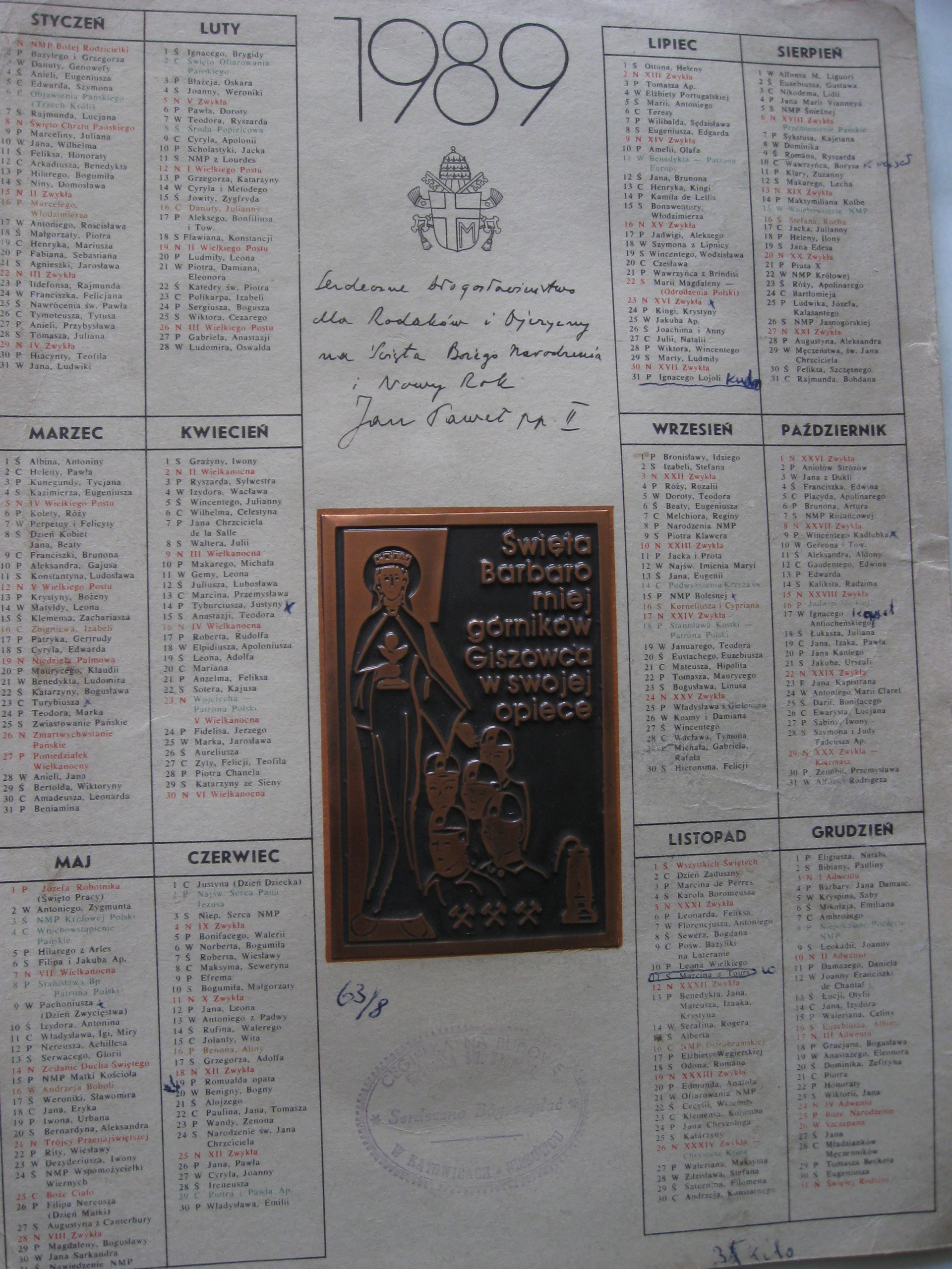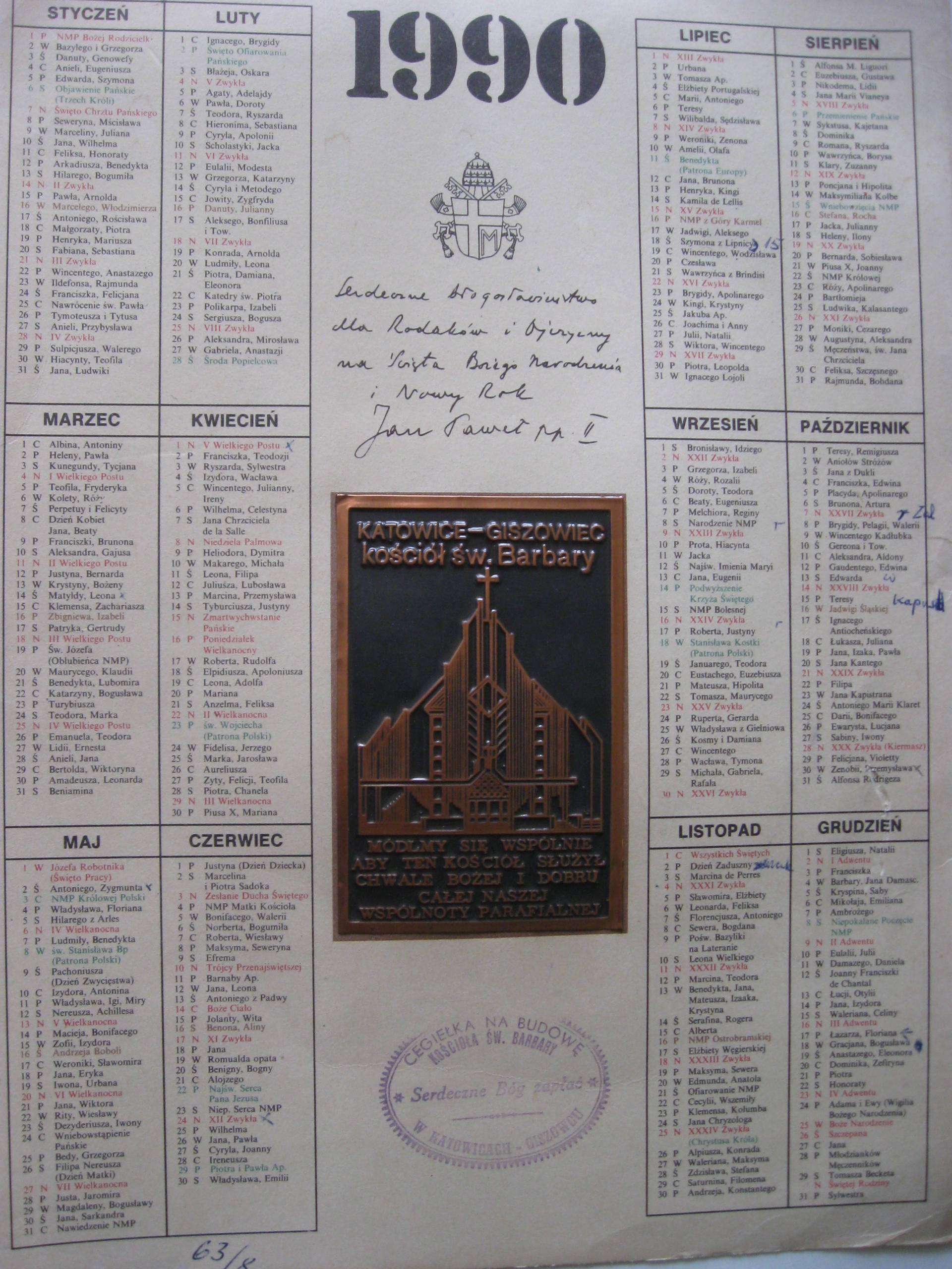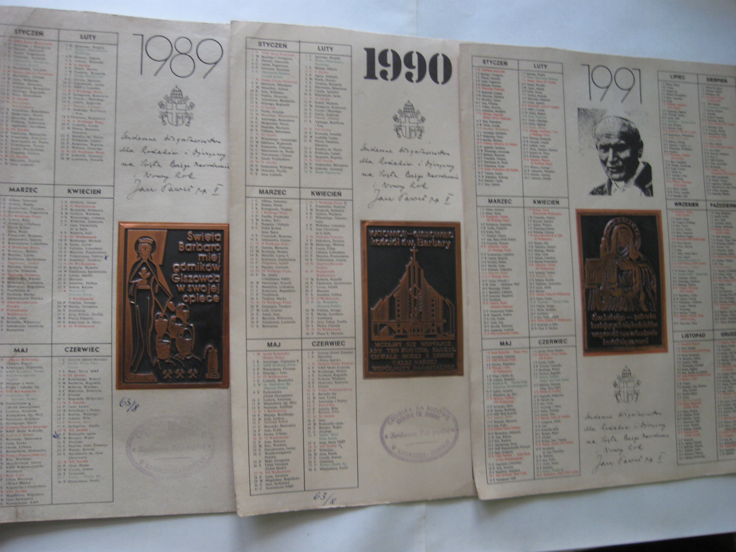 Три больших календаря (на 1989, 1990 и 1991 годы) - кирпичики с вклеенной медной пластиной - для строительство церкви св. Варвара в Катовице-Гишовце. Документы: