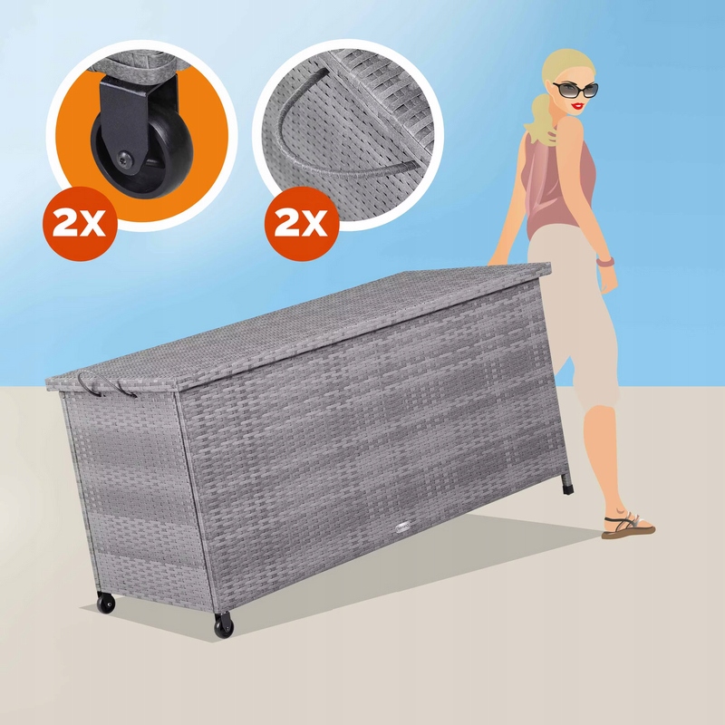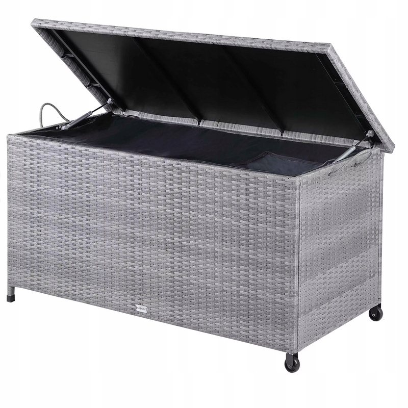 Идеальное место для хранения дома и в саду! Прочный сундук изготовлен из легкого полистана. Крышка коробки обеспечивает дополнительную стабильность - она подкреплена многопроизводными поликарбонатными пластинами. Крышка может быть легко открыта и закрыта благодаря автоматической системе подъема с 2 газовыми пружинами. Кроме того, капюшон во всей трассе допускает отток дождевой воды, благодаря которой вода не попадает в садовую коробку через зазор. Ящик для хранения может быть легко перенесен благодаря двум колесам и двум ручкам. Вы хотите безопасно хранить свои садовые подушки? Наша грудь обеспечивает оптимальную защиту от влаги и насекомых. Внутренняя полиэфирная подкладка водонепроницаем и прикреплена к внутренней части садовой коробки с липучкой. Внутренняя подкладка также может быть открыта и закрыта с помощью молнии. Полюс ротанга - очень стабильный, равномерно раненый пластиковый волокно, который был специально разработан для садовой мебели. Полираттан обладает высоким для грязи и легко чиститься.
