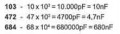 Конденсаторы керамические до 50В. В случае трехзначной кодовой маркировки первые две цифры являются значащими цифрами, а третья цифра — показателем степени. Под фото примеры расшифровки маркировки.