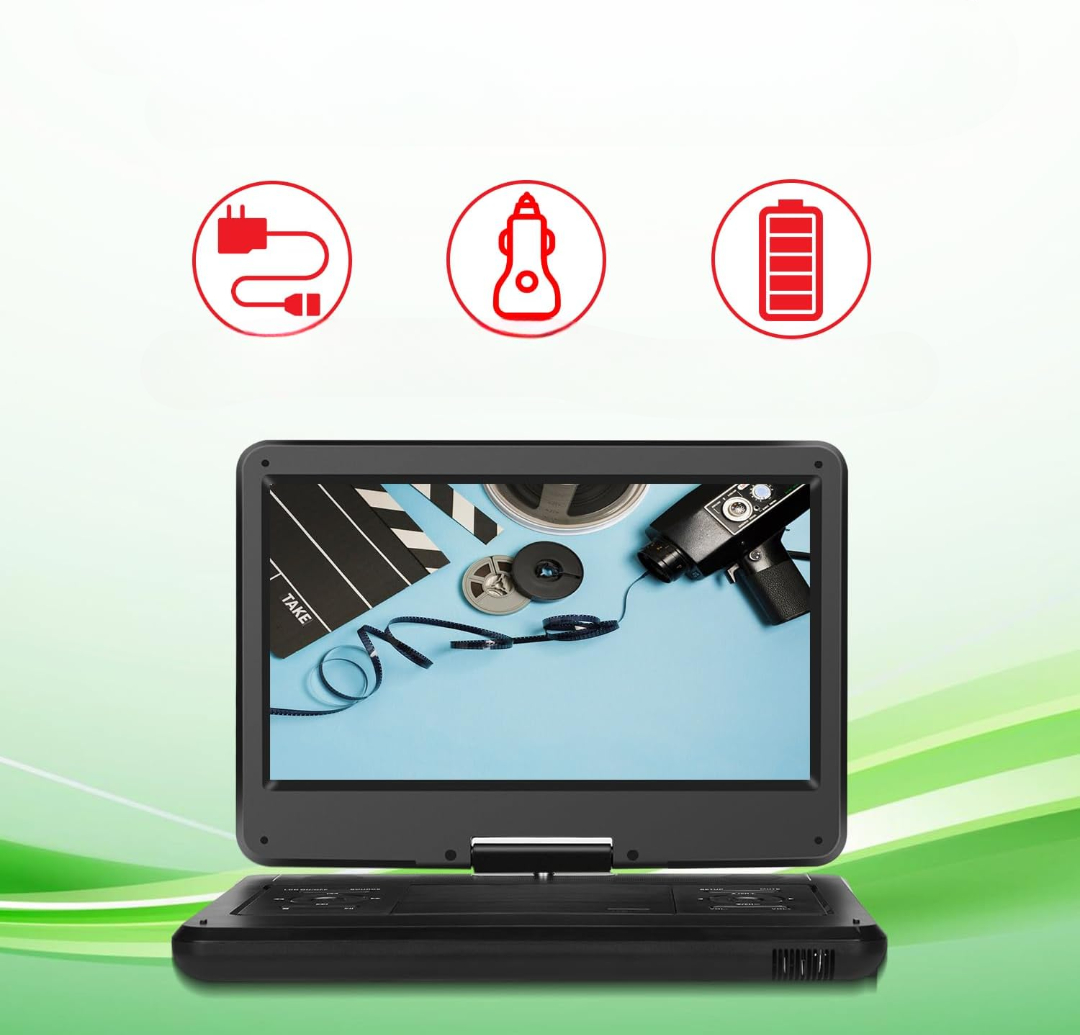 wbudowany akumulator do jadowania, zasilacz samochodowy 12 v i wtyczka zasilania glhewnejgo - Idealne do użytku w kamperze, przyczepie kempingj Wielokrotnego ładowania (Do 2-2,5 Godziny) Lub Zasilacza Samochodowego 12 V (W Zestawie). Или используйте этот небольшой портативный DVD, подключенный к источнику питания сети (заглушка в наборе)
