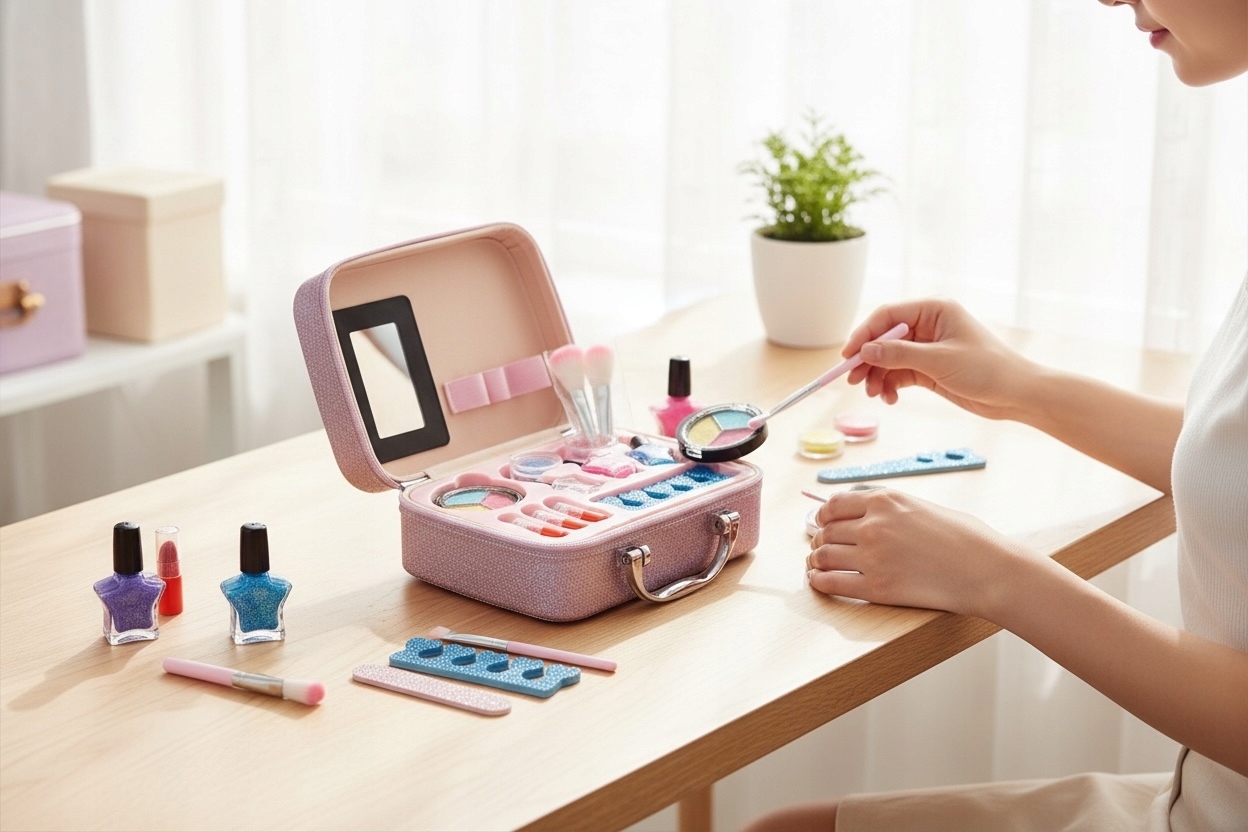 При открытии внутри ждет набор косметики и аксессуаров. укладка: