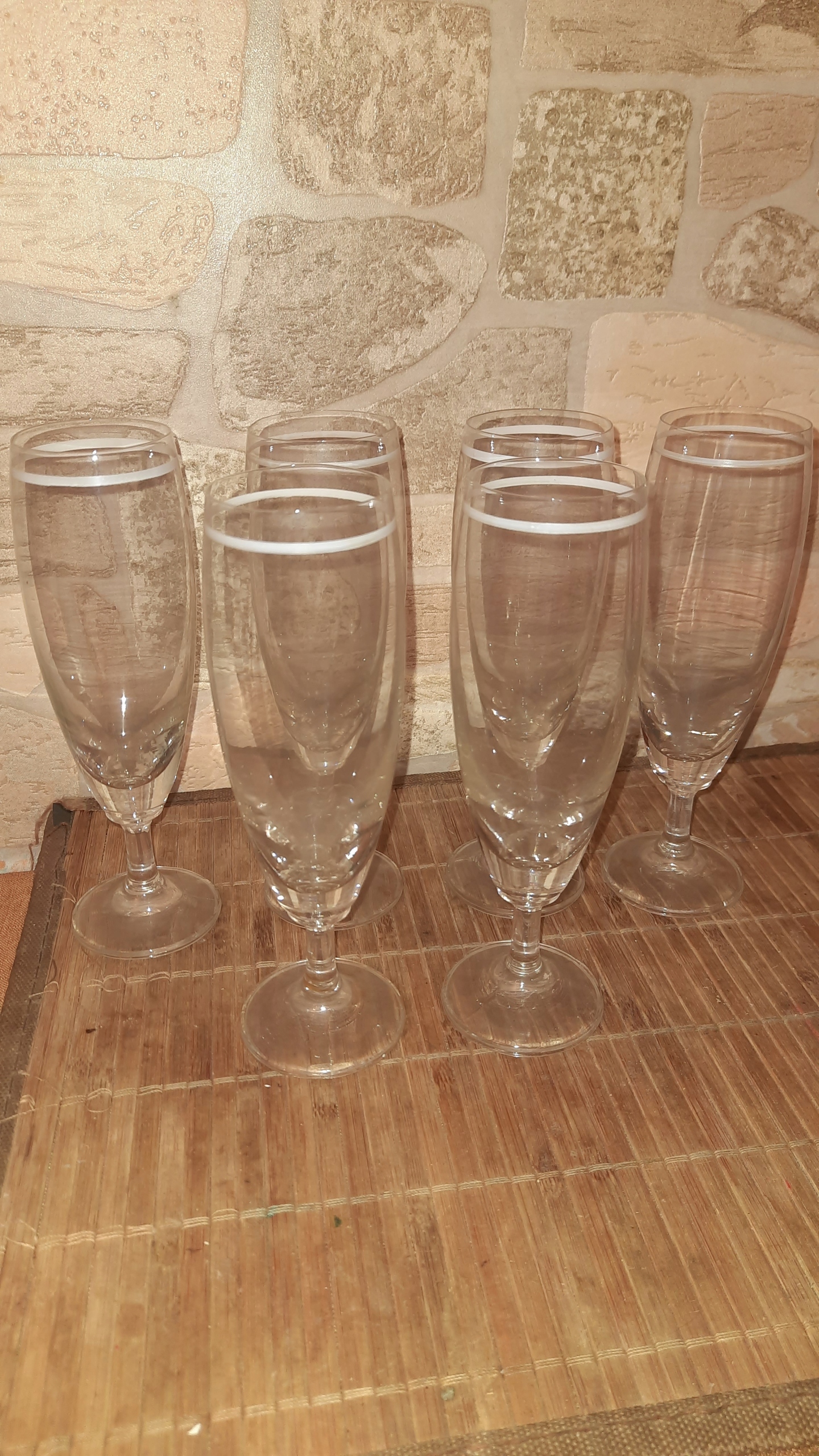 Бокалы для шампанского 170мл, 6 шт., высота 18 см, диаметр отверстия 5 см, диаметр основания 5,5 см, декор белой полосой, хорошее состояние