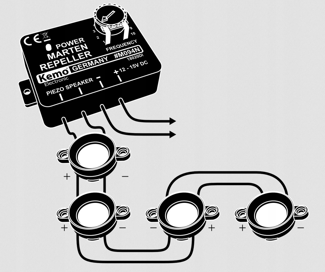 Ультразвуковой модуль необходимо подключить, как показано на рисунке. Он может работать с напряжением от 12 В постоянного тока до 15 В постоянного тока (аккумулятор автомобиля или грузовика). Также возможно использовать модуль питания 12 В постоянного тока. К устройству можно подключить до пяти пьезоэлектрических динамиков. Кабели, ведущие к динамикам, могут иметь длину до 50 метров. Отпугиватель Kemo M094N можно регулировать по частоте издаваемого звука.