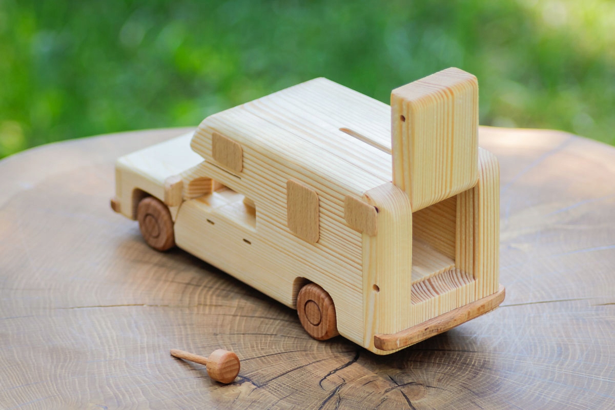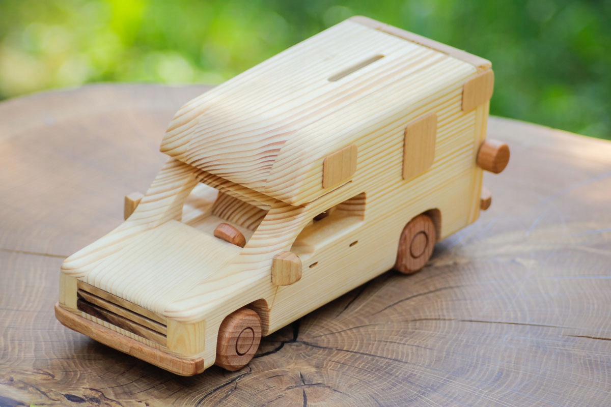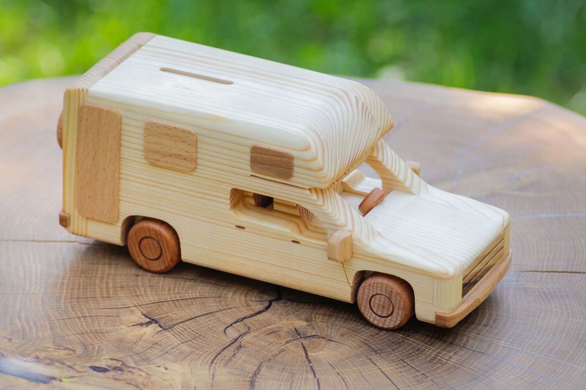 Автомобильная копилка из дерева, сделанная вручную в ремесленных методах. Стилизован под кемпер типа «Кемпер».