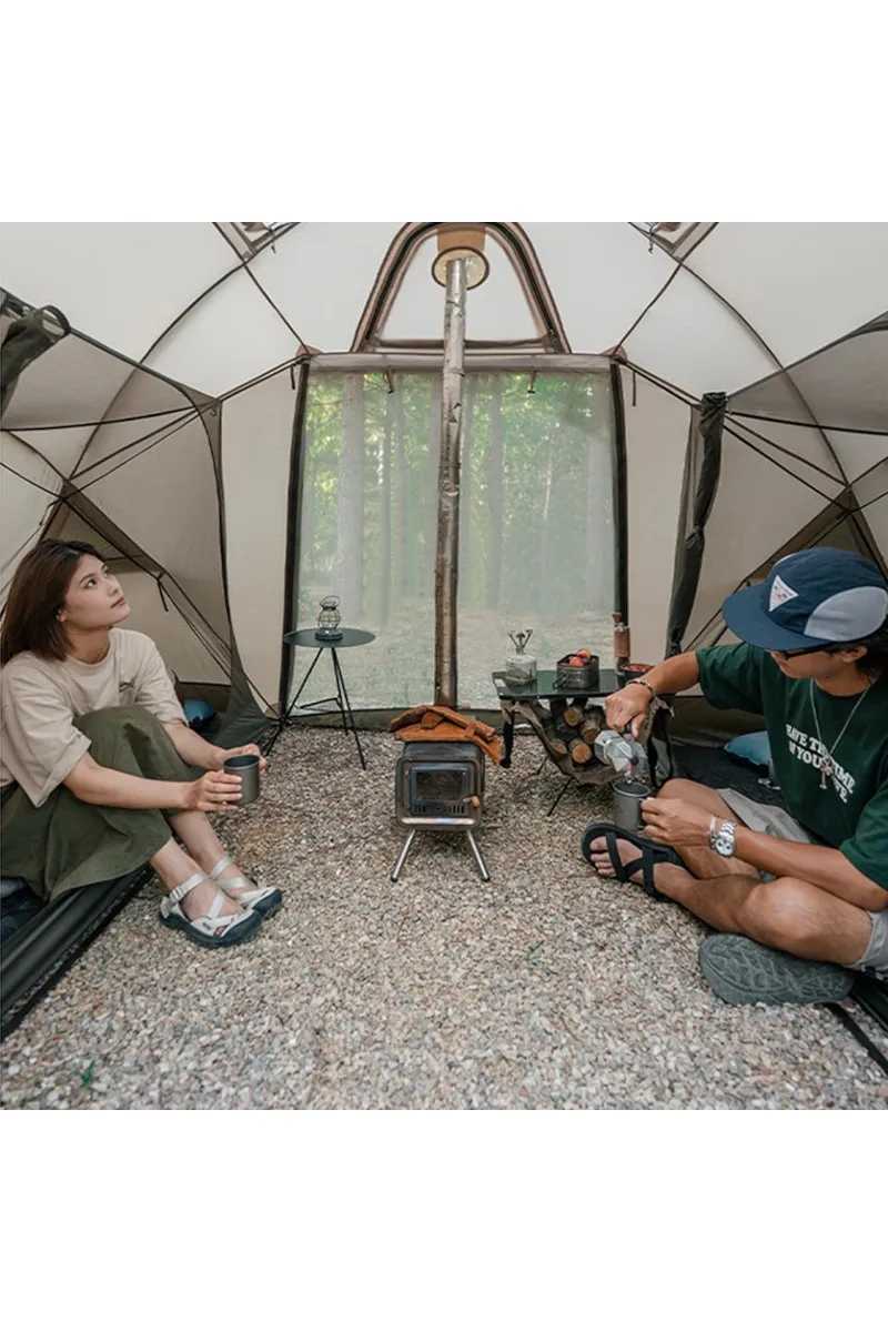 Благодаря своей конструкции палатка представляет собой удобный и функциональный переносной «дом» в путешествии. Закрытые вентиляционные отверстия, расположенные рядом со спальнями, обеспечивают оптимальную циркуляцию воздуха внутри. Центральная часть достаточно высока, чтобы можно было удобно расположиться на туристических креслах. В случае плохой погоды здесь также можно приготовить еду. Палатка имеет целых 4 входа – два ведут непосредственно в спальни и расположены в самых нижних ее частях, а 2 расположены друг напротив друга в жилой зоне. Эти входы создаются створками, закрывающимися на два замка. При необходимости их можно использовать для создания дополнительных крыш для расширения защищенного от солнца или дождя пространства. В верхней части палатки имеются прозрачные окна, которые можно закрыть жалюзи. Внутри палатки имеется крючок для фонаря и карманы для мелочей. Материал тента имеет покрытие UPF50, защищающее от УФ-излучения.
