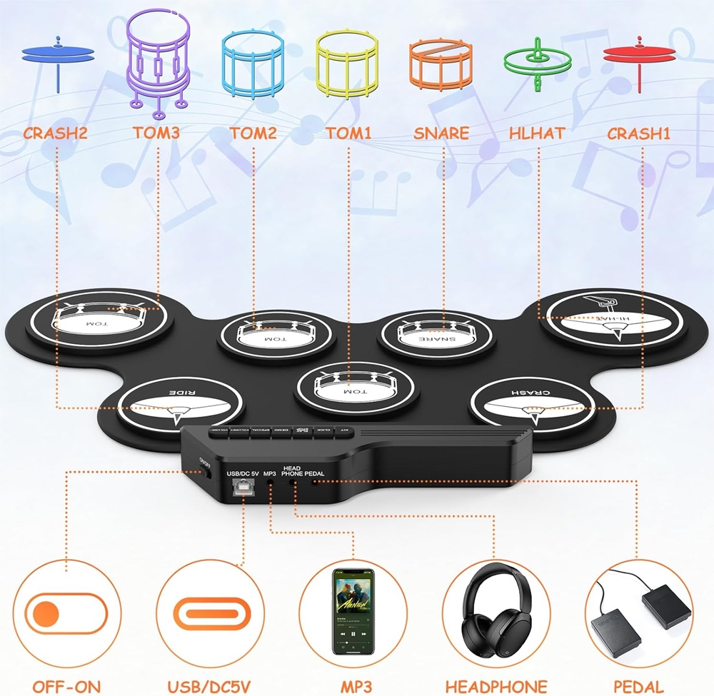 Компактный и универсальный набор барабанов, идеально подходящий для обучения и упражнений, предназначенный для начинающих музыкантов. Благодаря инновационному дизайну, набор сочетает в себе функциональность, легко переносить и хранить. Силиконовые подушки (том 3, Snare, Hi-Hat, Crash, Ride), моделирование реальных эффектов барабанов. Special. CHA, Swing Hi -Hat, Upbeat Rock) для универсального музыкального опыта. Полем Дополнительный вход MP3 позволяет воспроизводить музыку из мобильных устройств /li>