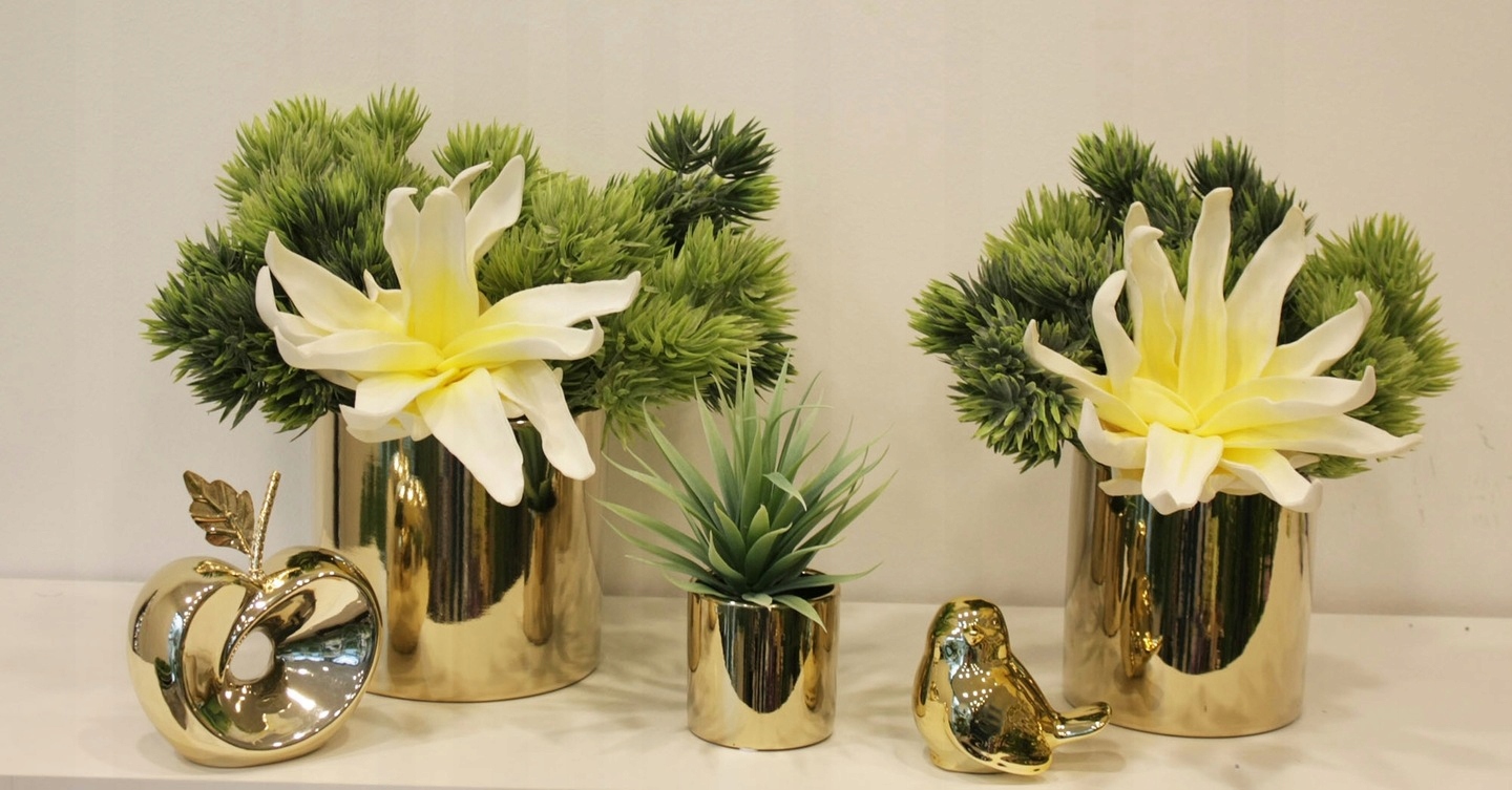 Элегантная керамическая крышка в форме цилиндра. Гладкая, металлизированная, сильно блестящая поверхность с зеркальным эффектом – чрезвычайно модно в этом сезоне! Гламурный стиль. Горшок изготовлен из высококачественной тонкостенной керамики, покрытой золотой глазурью.