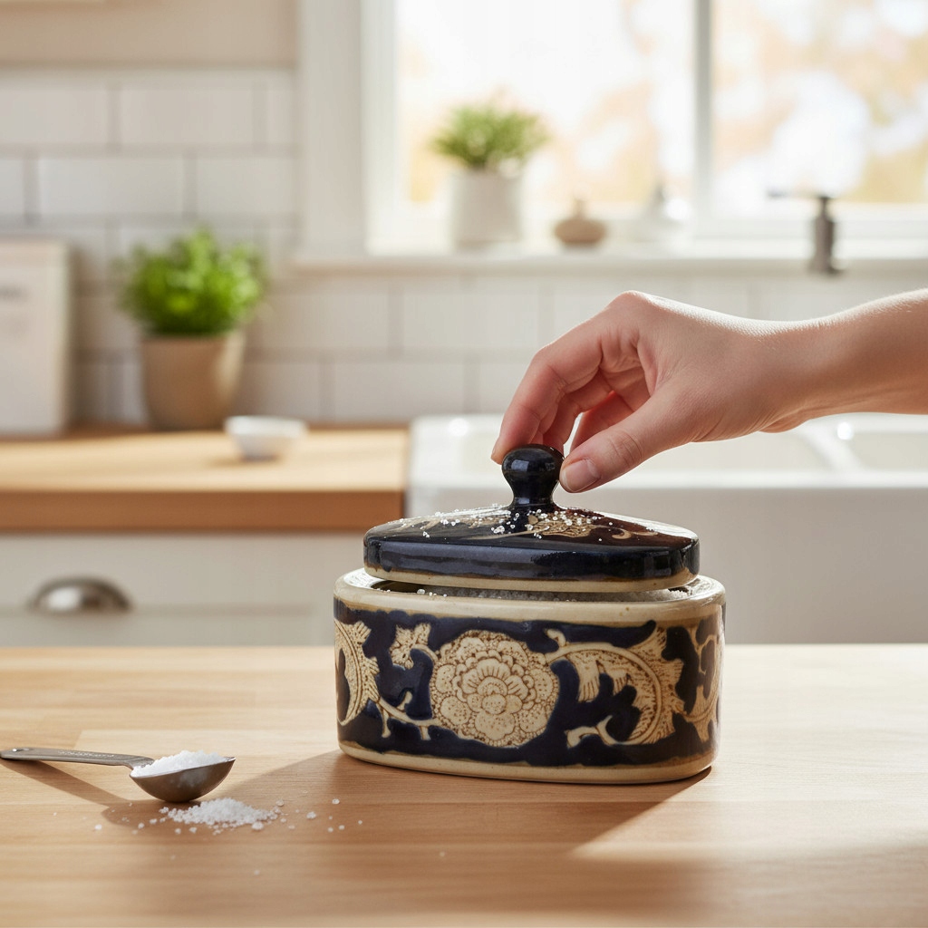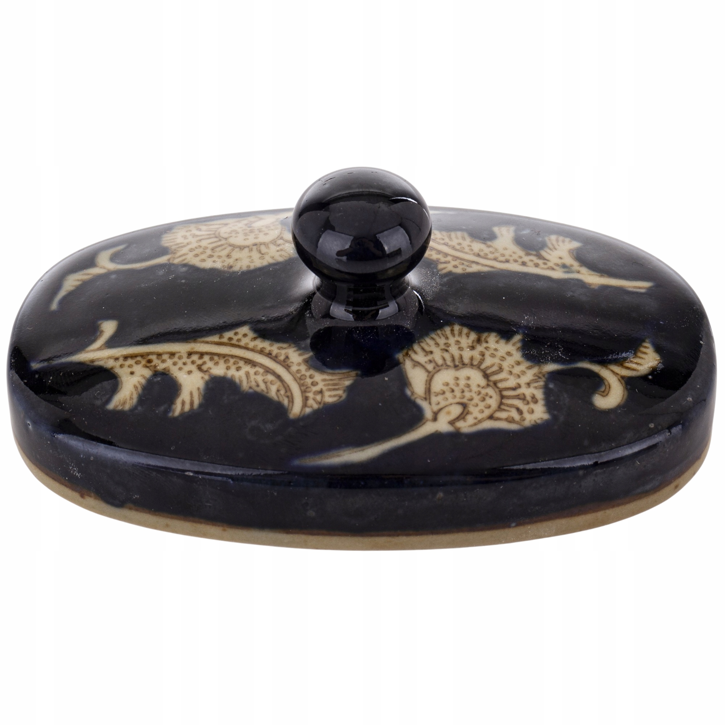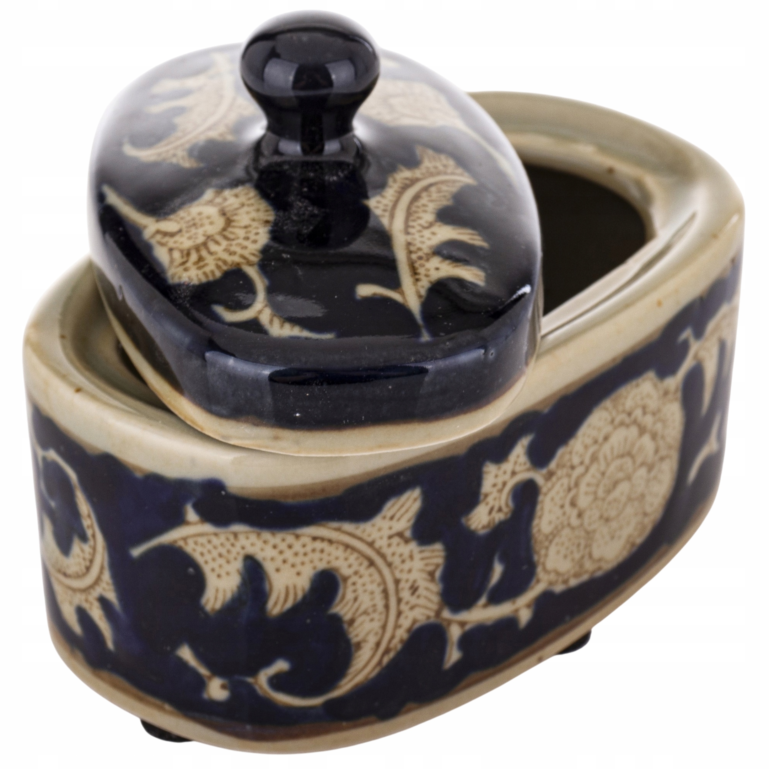 Декоративная керамическая шкатулка с крышкой, украшенная растительным мотивом в коричневых и темно-синих оттенках. Идеально подходит для хранения безделушек, украшений или как элегантный элемент дизайна интерьера. Детали ручной работы и классическая форма придают ему уникальный, вневременной характер. Прекрасное дополнение к ретро, деревенскому или восточному интерьеру.