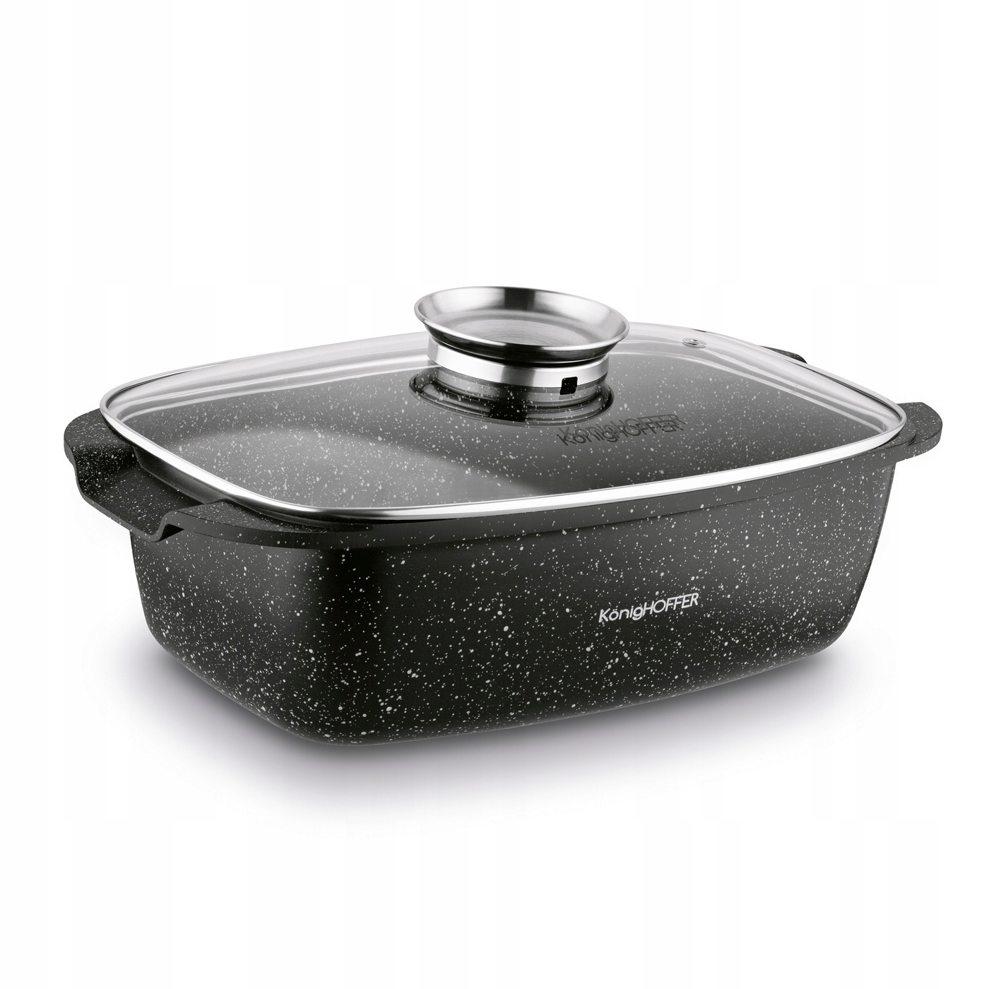 Керамическая жаровня Konighoffer Kingstone прямоугольной формы (объем 5,5 л, внутренние размеры 32 х 20,5 х 10,5 см) обеспечит вам высокий уровень комфорта во время приготовления пищи. Он защитит ингредиенты от пригорания и прилипания. Он будет нагреваться равномерно и быстро. Это позволит эффективно тушить под крышкой и постоянно контролировать процесс приготовления блюда. Вы получаете многолетнюю долговечность благодаря литому под давлением алюминиевому корпусу и каменно-керамическому покрытию, устойчивому к многим тысячам циклов истирания. Это вариант для всех, кто ценит здоровую и питательную диету, например. приготовленные с минимальным количеством жира. Беспроблемный уход и долгий срок службы посуды из мрамора – другие основные преимущества приобретения этой модели жаровни, имитирующей рисунок гранита. Вы можете использовать его на всех типах плит. Товар продается в наборе со стеклянной крышкой, оснащенной ароматизатором. Если вы его снимите, вы сможете использовать жаровню Kingstone для запекания при температуре до 200 градусов по Цельсию. Это один из лучших вариантов в этой категории! Литые ручки являются неотъемлемой частью корпуса сосуда. Поскольку никаких дополнительных соединений у них нет, они нагреваются вместе с жаровней. Это обусловливает необходимость использования защитных чехлов (тканевых, силиконовых) или кухонных рукавиц при переносе изделия на плиту и обратно, а также вынимании его из духовки, чтобы не обжечь руки. Роль силиконовых/тканевых чехлов/перчаток для духовки заключается в оптимальной защите рук пользователя от ожогов. В случае с представленным блюдом они являются элементом, необходимым для того, чтобы снять жаровню с плиты, переместить ее или вынуть модель из духовки. Они не только обеспечивают надежный захват, но и изолируют тепло от кожи. Естественно, что будет ощущаться некоторая жара. Однако его уровень будет поддерживаться на безопасном уровне.