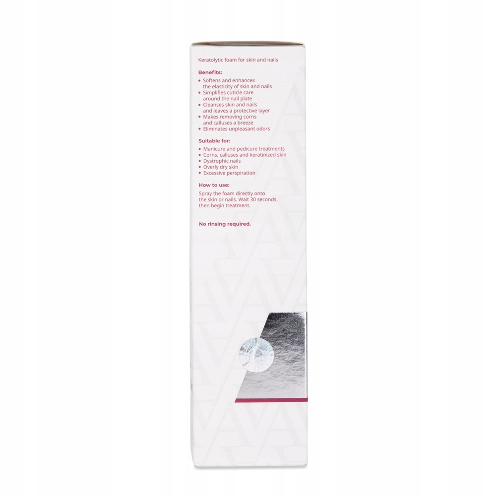 Кератолитическая пена создана для специалистов в области подологии, педикюра и маникюра. Его расширенная формула эффективно поддерживает лечение ухода, , облегчая развитие изменений в ногах и гвоздях. Разработка инфекции. Продукт характеризуется мягким и тонким запахом, который является важным преимуществом во время лечения в офисе, потому что он обеспечивает приятное применение как для специалиста, так и для клиента