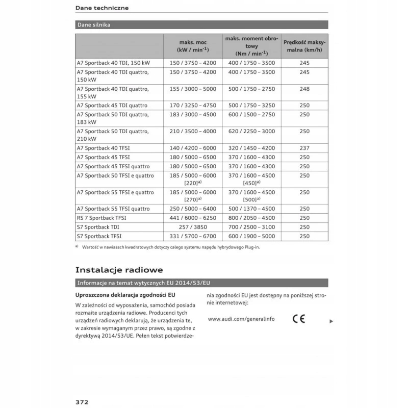 <р> Модель Audi A7 C8 2017 года. А7 Спортбэк S7 Спортбэк RS7 Спортбэк <р> В данном руководстве описаны: бензиновые и дизельные двигатели, дополнительные главы, описывающие навигацию и все медиа <р> Тип - книга Состояние - новый Страниц - 390 Польский язык Издание - 2020 г. Обложка - цвет Центр - черно-белый Бумага - меловая матовая А5 210х149Руководство для владельца Audi содержит все версии оборудования и полезную информацию о том, как эффективно и безопасно использовать автомобиль, например: - указатели поворота, контрольные лампы, открывание и закрывание - освещение и обзорность, сиденья, отсеки для хранения вещей, отопление, вентиляция, кондиционирование воздуха. - советы по вождению, эксплуатации, обслуживанию автомобиля - уровни жидкостей, проверка и доливка, аварийные операции, замена колес, предохранителей, замена лампочек - технические данные... и многое другое, что дает путешественникам ощущение безопасности и комфорта.Польское законодательство обязывает продавца приложить к . Руководство к машине новое, на польском языке.