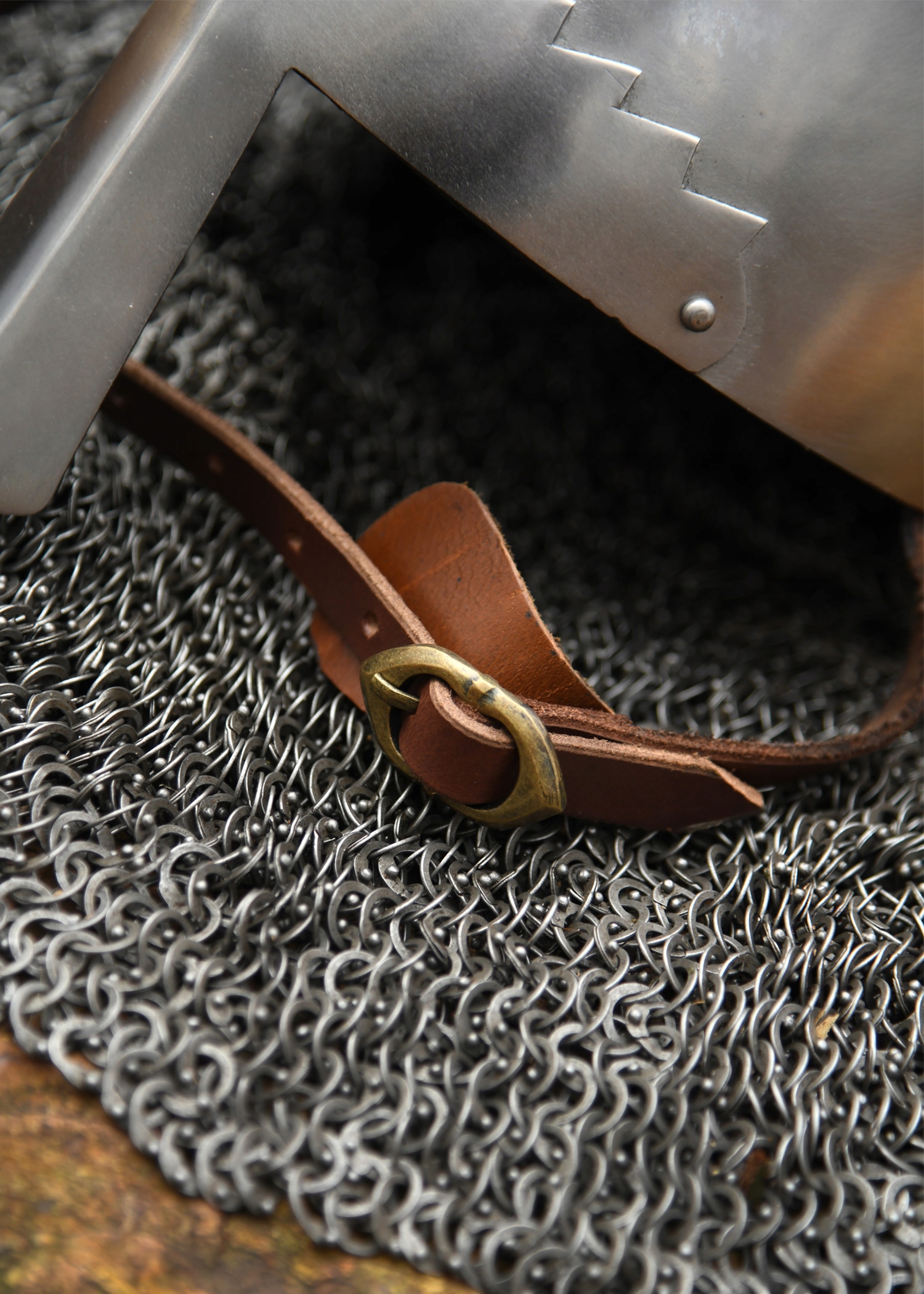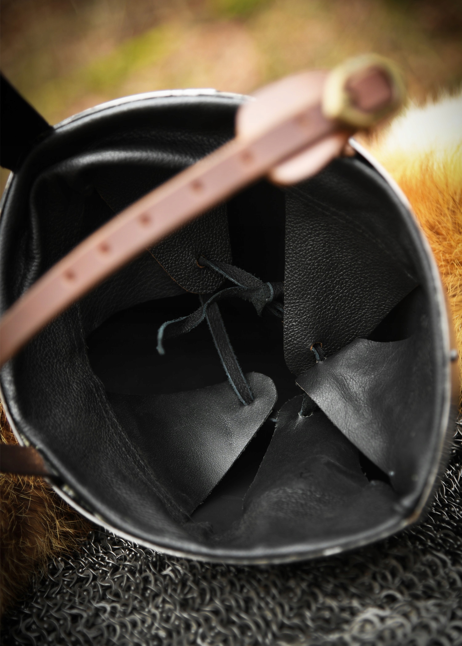 Этот шлем изготовлен из стали с толщиной около 1 мм и имеет регулируемую кожаную подкладку с ремнем для бороды.