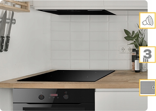 Черный фильтр является неотъемлемой частью капюшона, практически незамечен. Это увеличивает эстетическую ценность устройства, благодаря которой он идеально подходит для современных домов, где важна забота о каждой детали.
