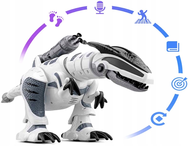 Большой робот-динозавр CYBER — отличная игрушка для детей, с ним очень весело играть. Интерактивный робот может ходить вперед и назад, поворачиваться влево и вправо, скользить, танцевать, говорить на языке робота, качать головой, вилять хвостом и стрелять