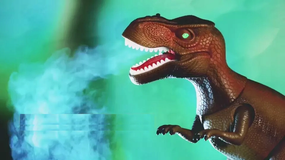 Динозавр имеет очень реалистичный вид, подвижную голову, двигает лапами, ходит, издает звуки, светится и выдыхает водяной пар.