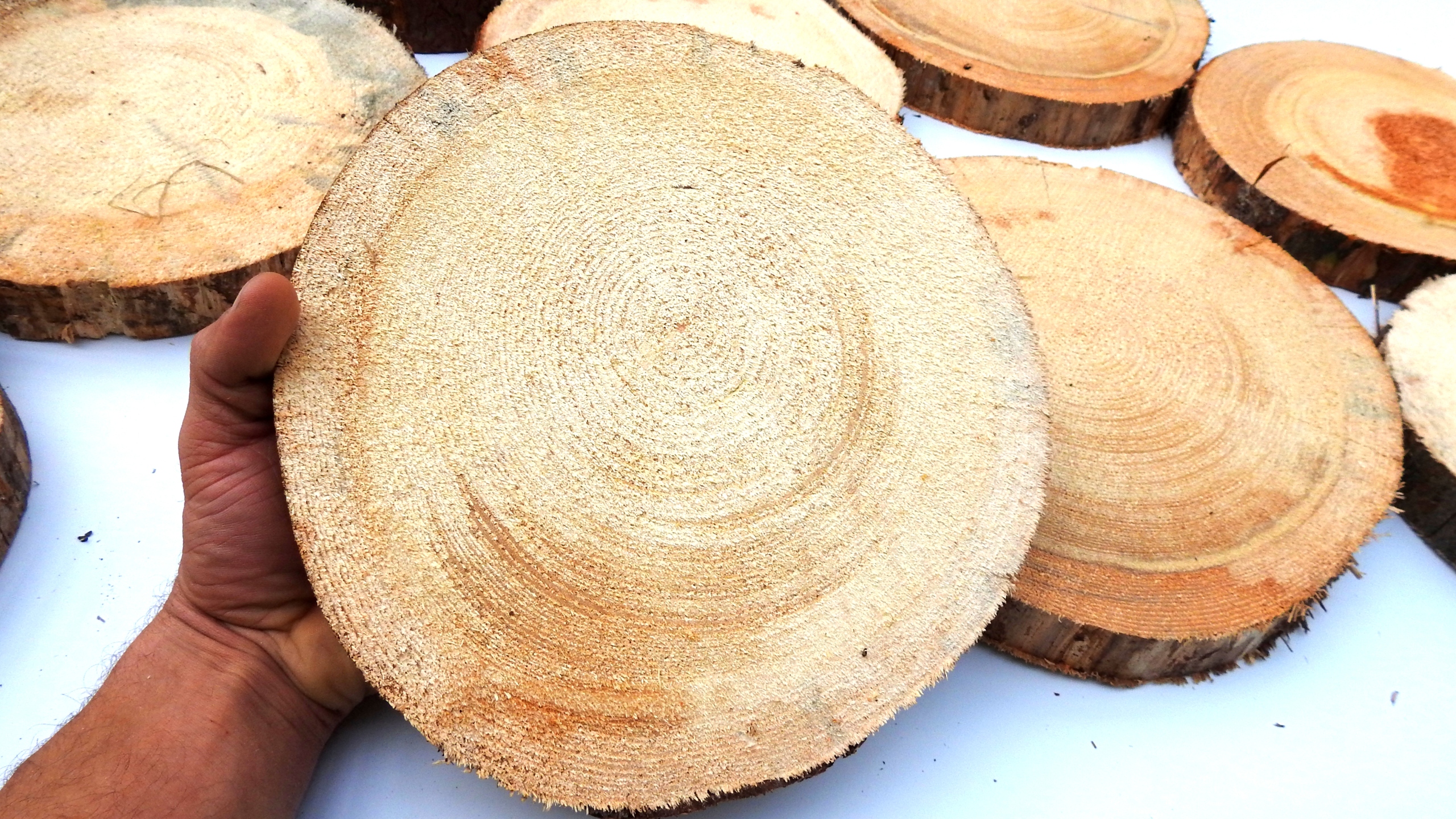 Поверхность ломтиков не полируется и после нарезки имеет первоначальную структуру.Внимание:Ломтики требуют сушки, так как они свеженарезанные.Неправильная сушка или отсутствие сушки, оставление ломтиков во влажной среде приводит к их плесневению! Это касается как свежих, так и сушеных срезов.Лучше всего обеспечить приток воздуха к каждому срезу, что позволит обеспечить щадящую сушку и предотвратить чрезмерное растрескивание древесины - чем медленнее мы сушим, тем меньше трещин.Трещины появляются часто из-за того, что древесина распилена поперек зерно имеет такие тенденции.
