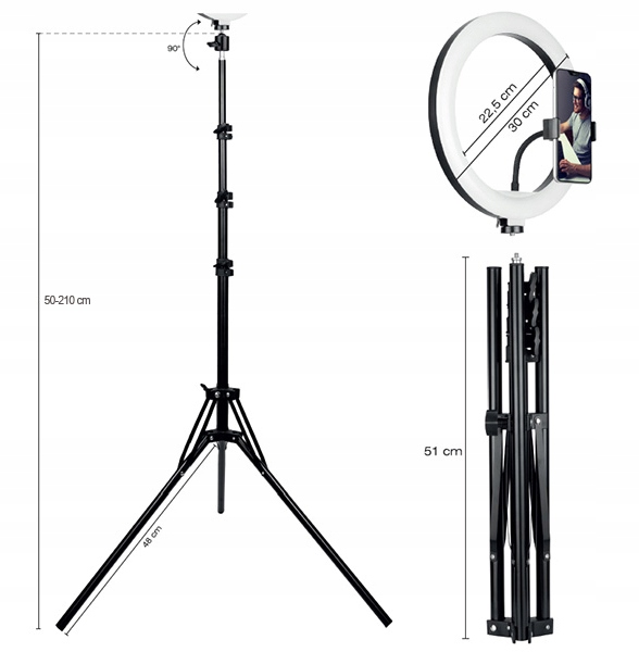 Светодиодная лампа 12 дюймов/30 см со штативом 210 см. Напольная, обогащенная светодиодами, версия кольцевой лампы RING, предназначенная для людей, которым требуется большая мощность и большие возможности регулировки положения источника освещения. 12 Кольцевой светильник имеет внутренний диаметр 24 см (30 см внешний) и 160 светодиодов, равномерно распределенных в осветительном кольцевом корпусе.