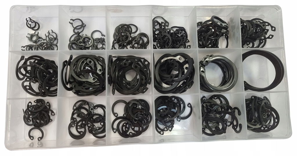 Набор из 300 внутренних и внешних колец сегера. Они хорошо держат кольца, они сделаны из постоянной эластичной стали. Разнообразие размеров в наборе дает уверенность в том, что мы найдем правильный, необходимый размер. Набор используется в каждой профессиональной мастерской.