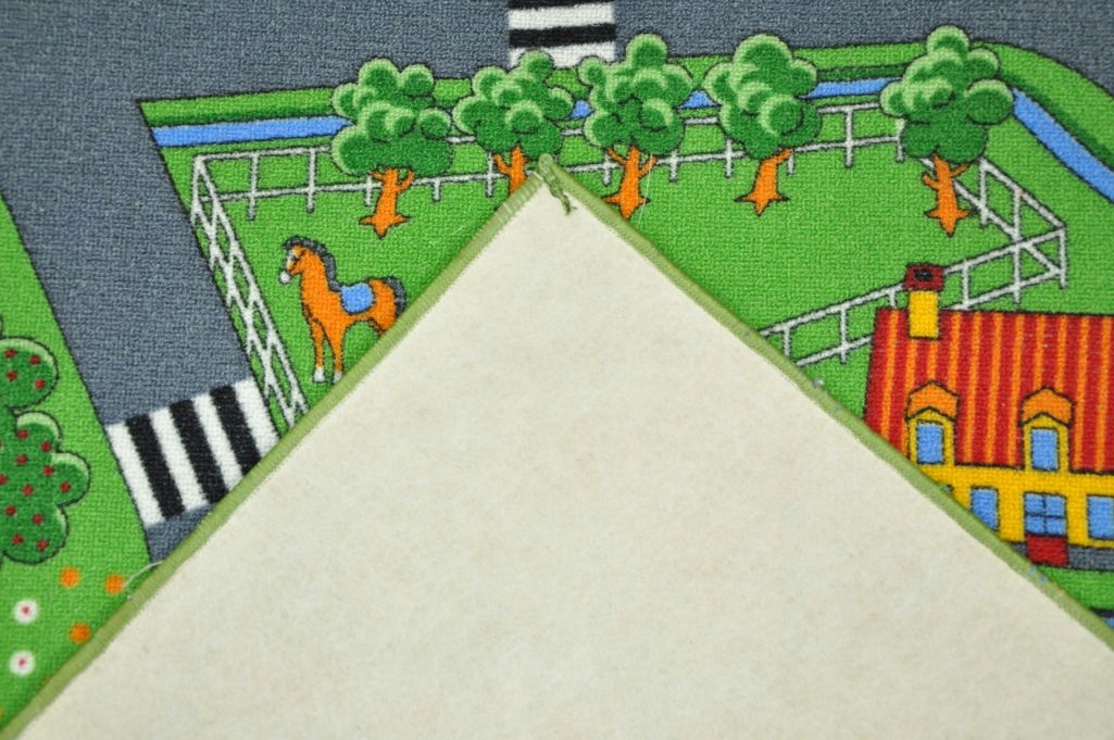 Разноцветный ковер с изображением сельских построек с дорогами, домами, пешеходным переходом, больницей, вертолетной площадкой, загоном для овец и деревьями.