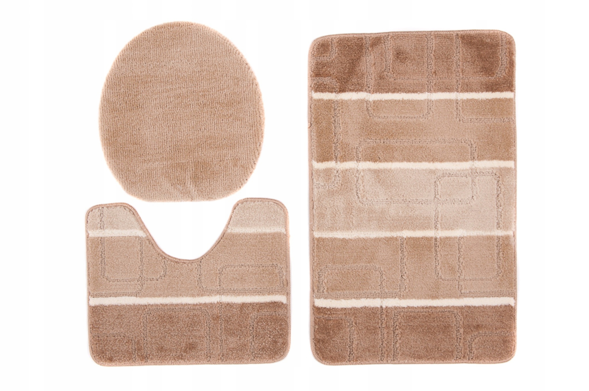 Резные узоры на ковриках – трехмерный эффект. Под ним имеется специальная противоскользящая резиновая подкладка. Коврики для ванной комнаты представляют собой широкий ассортимент стильных моделей, отличающихся современным геометрическим дизайном в приглушенных тонах серого, бежевого, коричневого, зеленого и синего.