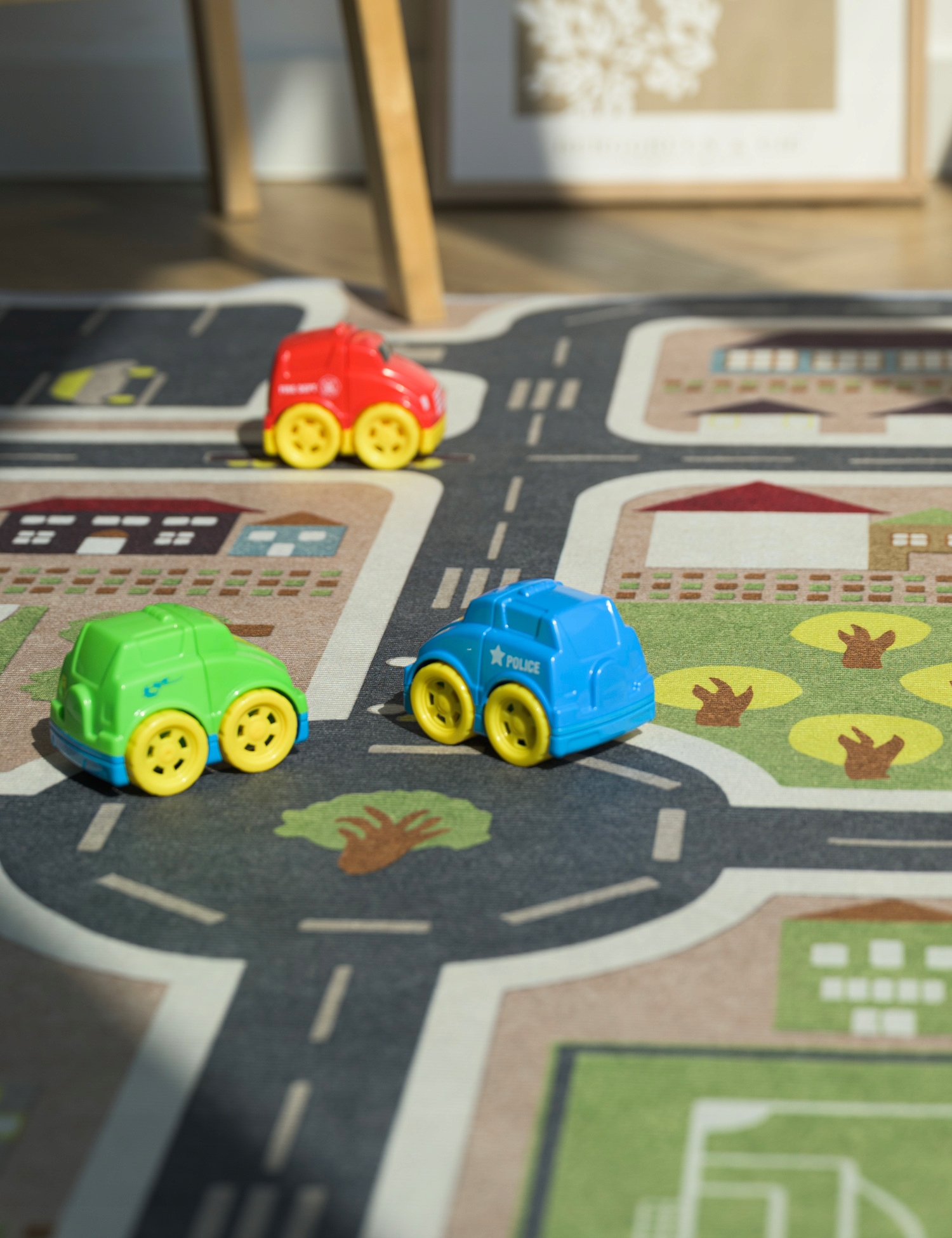 Ковер Streets отличается необычным рисунком. Линии улиц и красочные автомобили эффектно привлекают внимание детей. > Более того, ковер можно использовать как гоночную дорожку для игрушечных машинок!